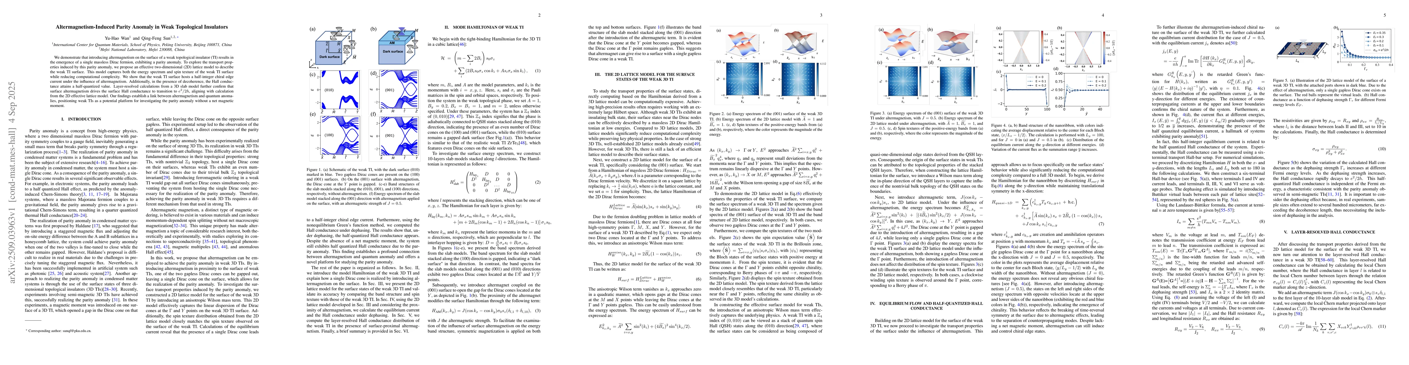 We demonstrate that introducing altermagnetism on the surface of a weak topological insulator (TI) results in the emergence of a single massless Dirac fermion, exhibiting a parity anomaly. To explore the transport properties induced by this parity anomaly, we propose an effective two-dimensional (2D) lattice model to describe the weak TI surface. This model captures both the energy spectrum and spin texture of the weak TI surface while reducing computational complexity. We show that the weak TI surface hosts a half-integer chiral edge current under the influence of altermagnetism. Additionally, in the presence of decoherence, the Hall conductance attains a half-quantized value. Layer-resolved calculations from a 3D slab model further confirm that surface altermagnetism drives the surface Hall conductance to transition to $e^{2}/2h$, aligning with calculation from the 2D effective lattice model. Our findings establish a link between altermagnetism and quantum anomalies, positioning weak TIs as a potential platform for investigating the parity anomaly without a net magnetic moment.