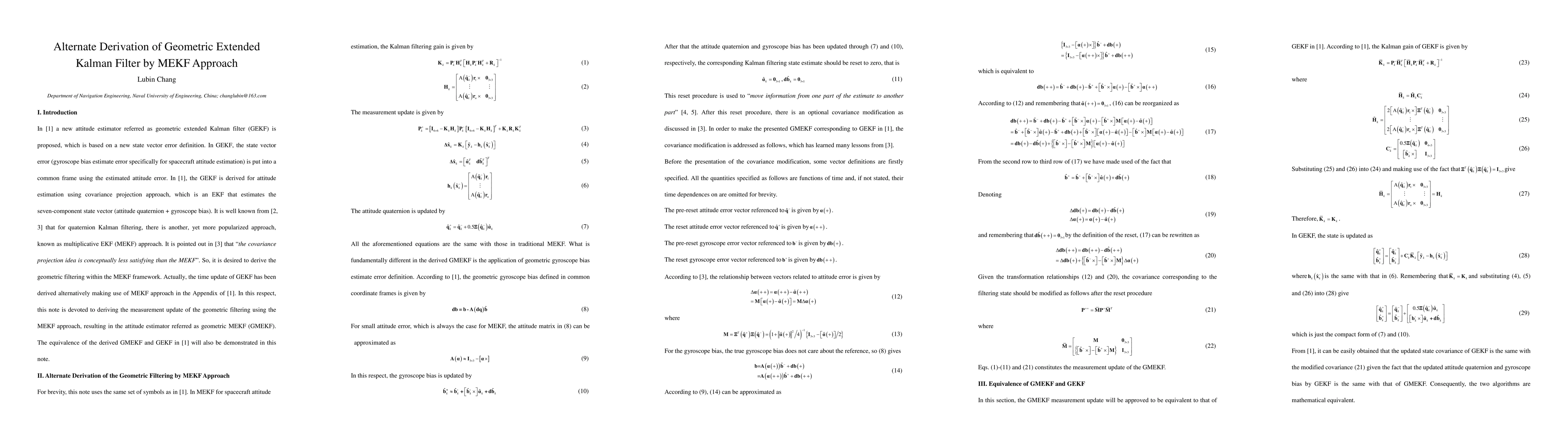 This paper presents an alternate derivation of the geometric extended Kalman filter (GEKF) using the multiplicative extended Kalman filtering (MEKF) approach, resulting in a new estimator called the geometric multiplicative extended Kalman filter (GMEKF). The study demonstrates the equivalence between theGMEKF and the original GEKF.