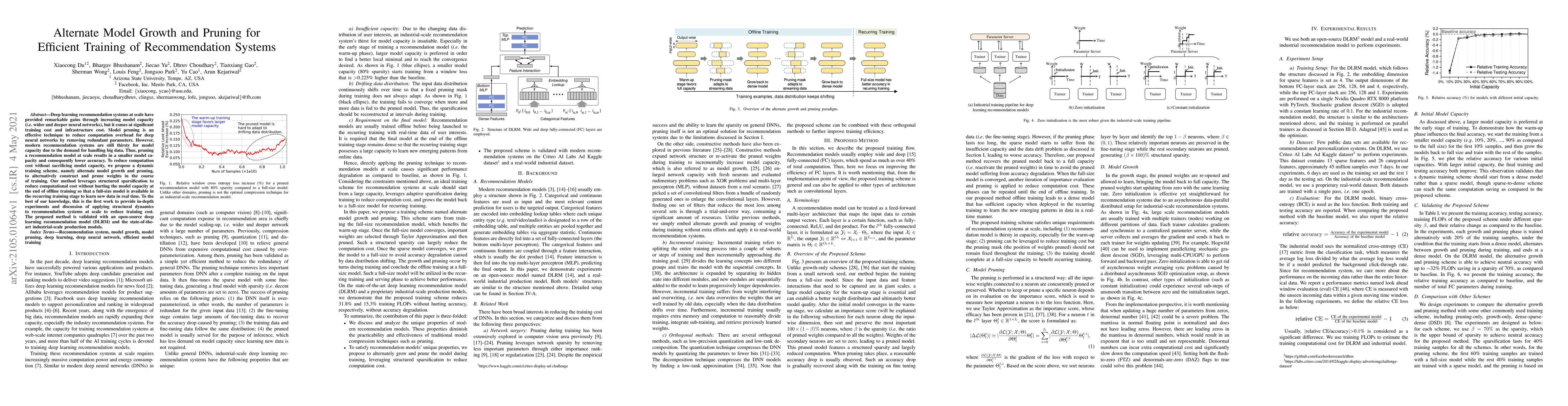 This paper proposes a dynamic training scheme combining model growth and pruning to optimize the training of large-scale recommendation systems, aiming to reduce computational costs without sacrificing model capacity. The method leverages structured sparsification and is validated through experiments with DLRM and industrial-scale models.