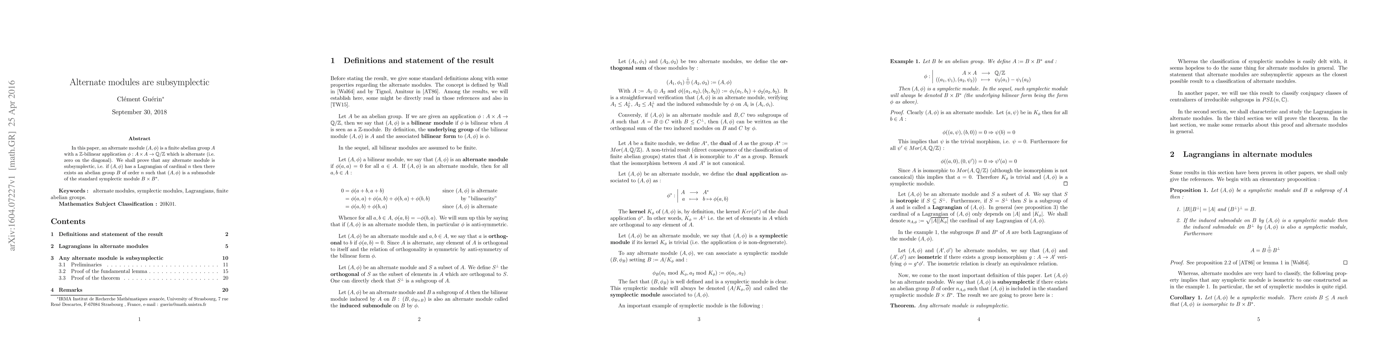 In this paper, an alternate module $(A,\phi)$ is a finite abelian group $A$ with a $\mathbb{Z}$-bilinear application $\phi:A\times A\rightarrow \mathbb{Q}/\mathbb{Z}$ which is alternate (i.e. zero on the diagonal). We shall prove that any alternate module is subsymplectic, i.e. if $(A,\phi)$ has a Lagrangian of cardinal $n$ then there exists an abelian group $B$ of order $n$ such that $(A,\phi)$ is a submodule of the standard symplectic module $B\times B^*$.