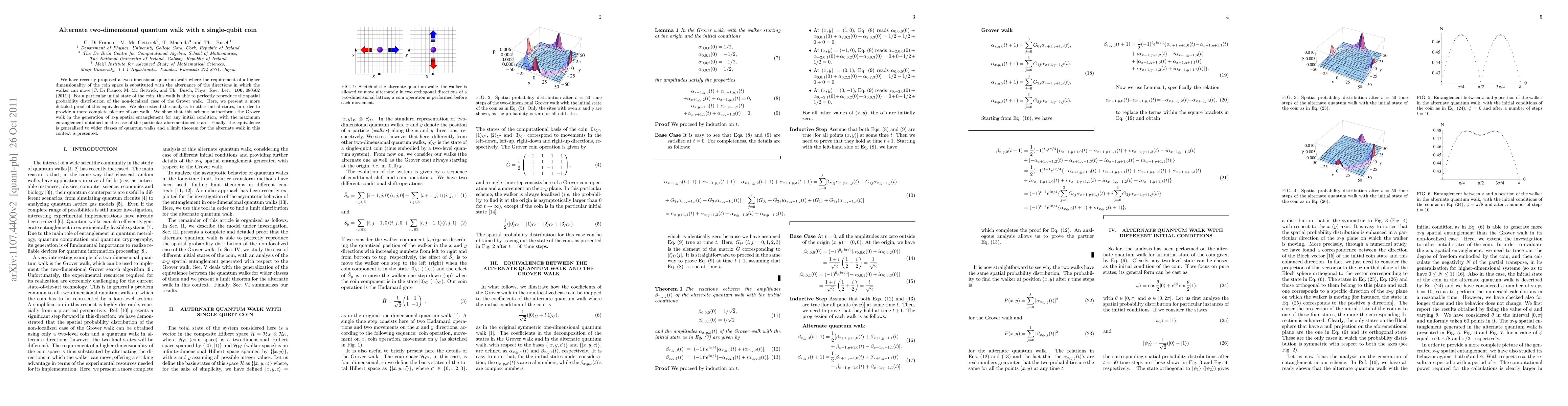 We have recently proposed a two-dimensional quantum walk where the requirement of a higher dimensionality of the coin space is substituted with the alternance of the directions in which the walker can move [C. Di Franco, M. Mc Gettrick, and Th. Busch, Phys. Rev. Lett. {\bf 106}, 080502 (2011)]. For a particular initial state of the coin, this walk is able to perfectly reproduce the spatial probability distribution of the non-localized case of the Grover walk. Here, we present a more detailed proof of this equivalence. We also extend the analysis to other initial states, in order to provide a more complete picture of our walk. We show that this scheme outperforms the Grover walk in the generation of $x$-$y$ spatial entanglement for any initial condition, with the maximum entanglement obtained in the case of the particular aforementioned state. Finally, the equivalence is generalized to wider classes of quantum walks and a limit theorem for the alternate walk in this context is presented.