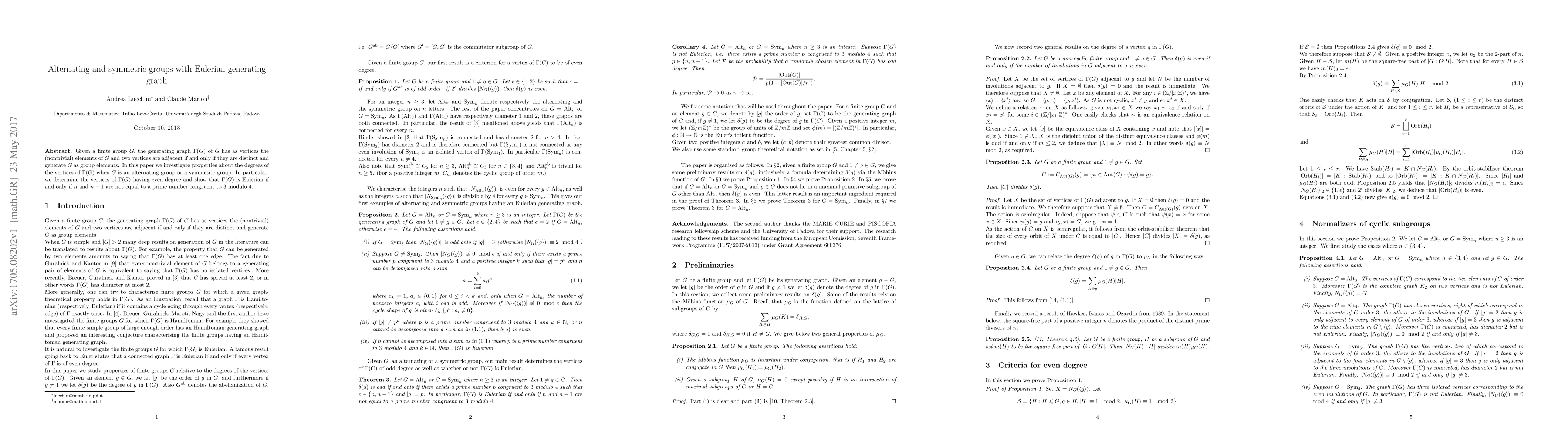 This paper investigates properties of Eulerian generating graphs for alternating and symmetric groups, focusing on vertices with even degrees and the conditions under which the graph is Eulerian.