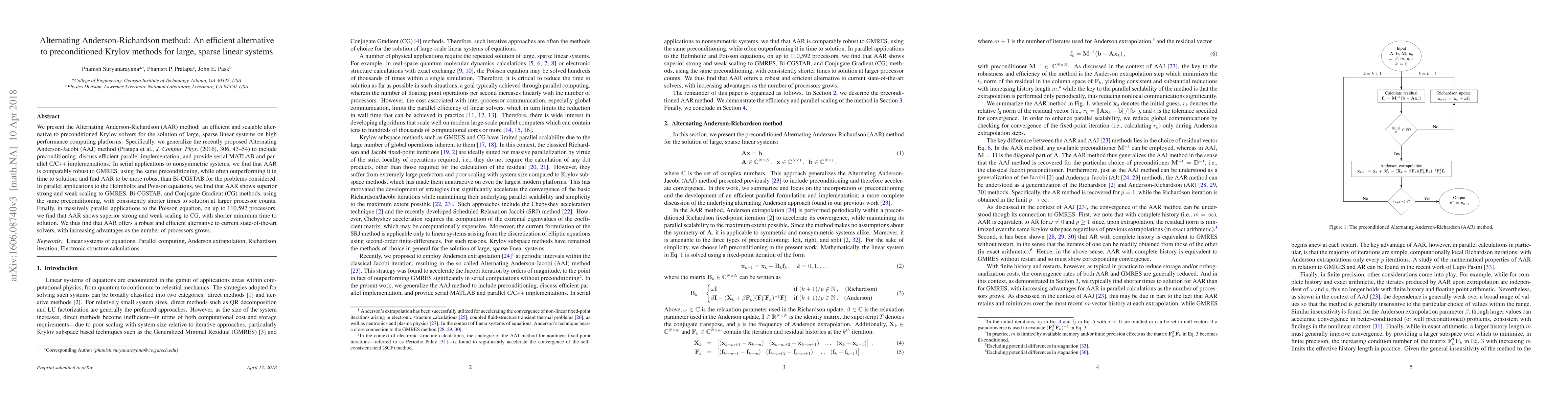 The Alternating Anderson-Richardson (AAR) method is presented as an efficient alternative to preconditioned Krylov solvers for large, sparse linear systems, showing comparable robustness to GMRES and often better performance in time to solution. In parallel applications, AAR demonstrates superior scaling and shorter solution times compared to GMRES, Bi-CGSTAB, and Conjugate Gradient methods, especially in massively parallel environments.