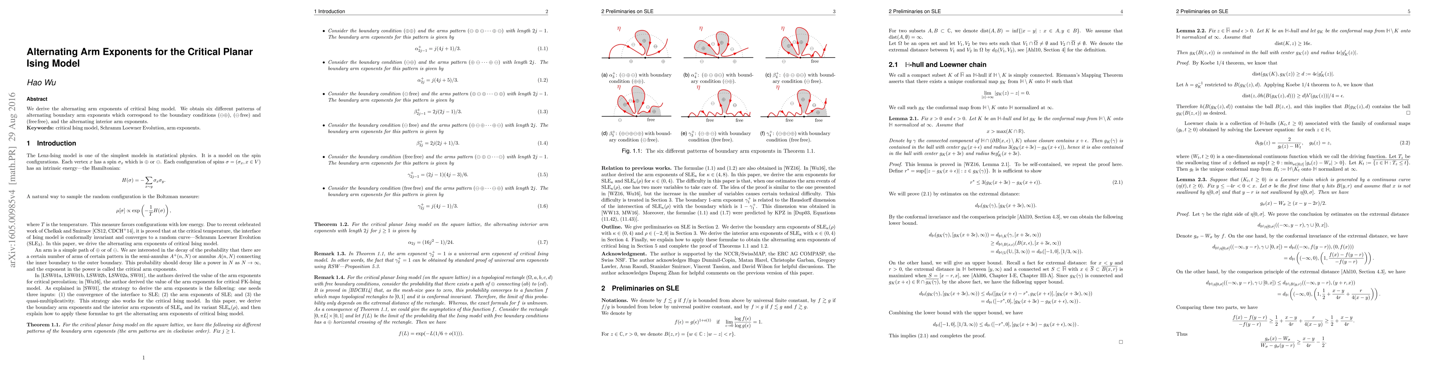 This paper derives the alternating arm exponents for the critical planar Ising model, identifying six distinct patterns corresponding to different boundary conditions and alternating interior arm exponents. These findings enhance the understanding of critical phenomena in the Ising model.