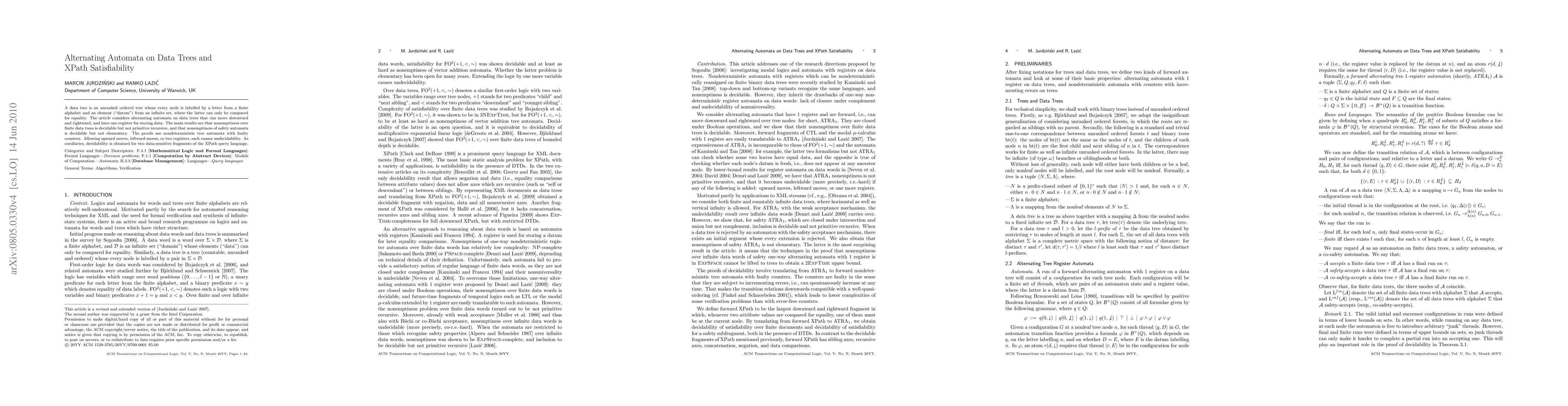 This paper explores alternating automata on data trees, showing decidability for nonemptiness but not for primitive recursive or elementary complexity. It also proves undecidability when upward or leftward moves are allowed, and derives decidability for specific XPath fragments.