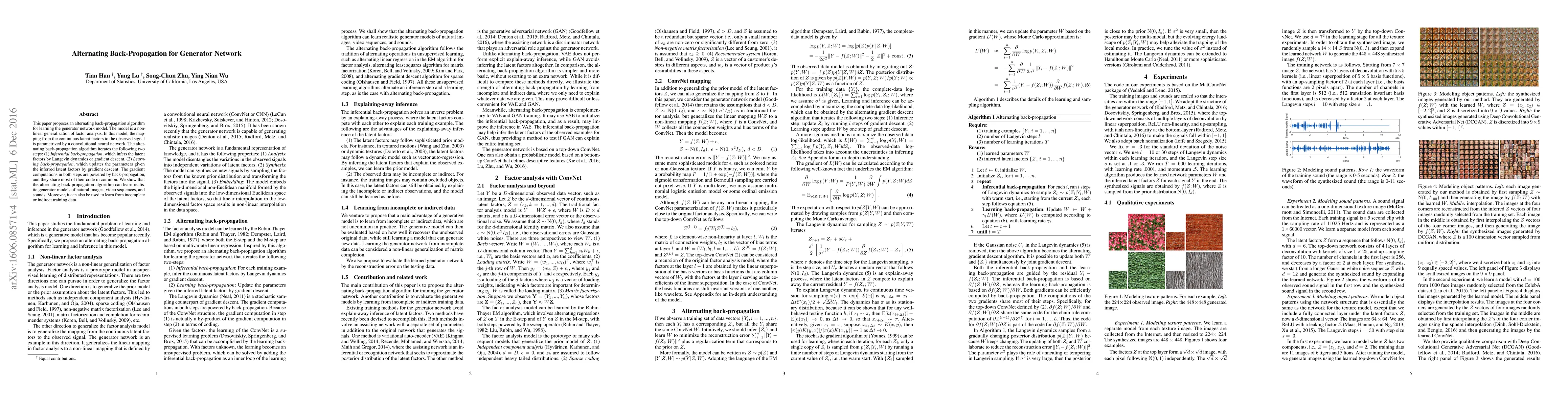 This paper introduces an alternating back-propagation algorithm for training generator networks, which generalizes factor analysis using convolutional neural networks. The algorithm alternates between inferential back-propagation and learning back-propagation, demonstrating its effectiveness in generating realistic natural images, videos, and sounds.
