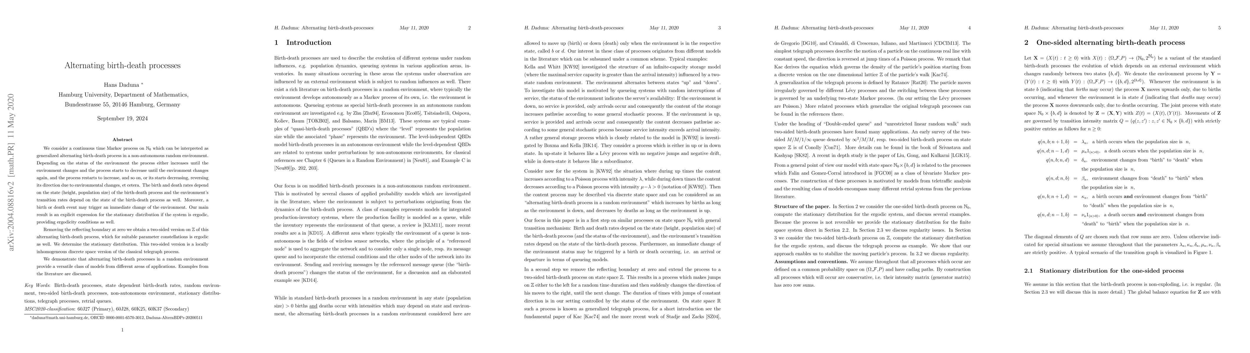 We consider a continuous time Markov process on $\mathbb{N}_0$ which can be interpreted as generalized alternating birth-death process in a non-autonomous random environment. Depending on the status of the environment the process either increases until the environment changes and the process starts to decrease until the environment changes again, and the process restarts to increase, and so on, or its starts decreasing, reversing its direction due to environmental changes, et cetera. The birth and death rates depend on the state (height, population size) of the birth-death process and the environment's transition rates depend on the state of the birth-death process as well. Moreover, a birth or death event may trigger an immediate change of the environment. Our main result is an explicit expression for the stationary distribution if the system is ergodic, providing ergodicity conditions as well. Removing the reflecting boundary at zero we obtain a two-sided version on $\mathbb{Z}$ of this alternating birth-death process, which for suitable parameter constellations is ergodic as well. We determine the stationary distribution. This two-sided version is a locally inhomogeneous discrete space version of the classical telegraph process. We demonstrate that alternating birth-death processes in a random environment provide a versatile class of models from different areas of applications. Examples from the literature are discussed.