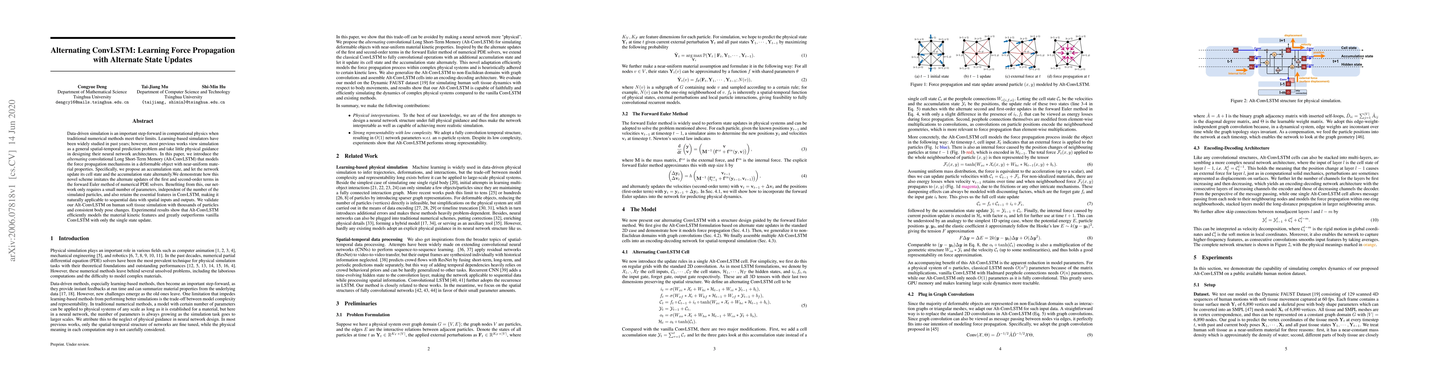 Data-driven simulation is an important step-forward in computational physics when traditional numerical methods meet their limits. Learning-based simulators have been widely studied in past years; however, most previous works view simulation as a general spatial-temporal prediction problem and take little physical guidance in designing their neural network architectures. In this paper, we introduce the alternating convolutional Long Short-Term Memory (Alt-ConvLSTM) that models the force propagation mechanisms in a deformable object with near-uniform material properties. Specifically, we propose an accumulation state, and let the network update its cell state and the accumulation state alternately. We demonstrate how this novel scheme imitates the alternate updates of the first and second-order terms in the forward Euler method of numerical PDE solvers. Benefiting from this, our network only requires a small number of parameters, independent of the number of the simulated particles, and also retains the essential features in ConvLSTM, making it naturally applicable to sequential data with spatial inputs and outputs. We validate our Alt-ConvLSTM on human soft tissue simulation with thousands of particles and consistent body pose changes. Experimental results show that Alt-ConvLSTM efficiently models the material kinetic features and greatly outperforms vanilla ConvLSTM with only the single state update.