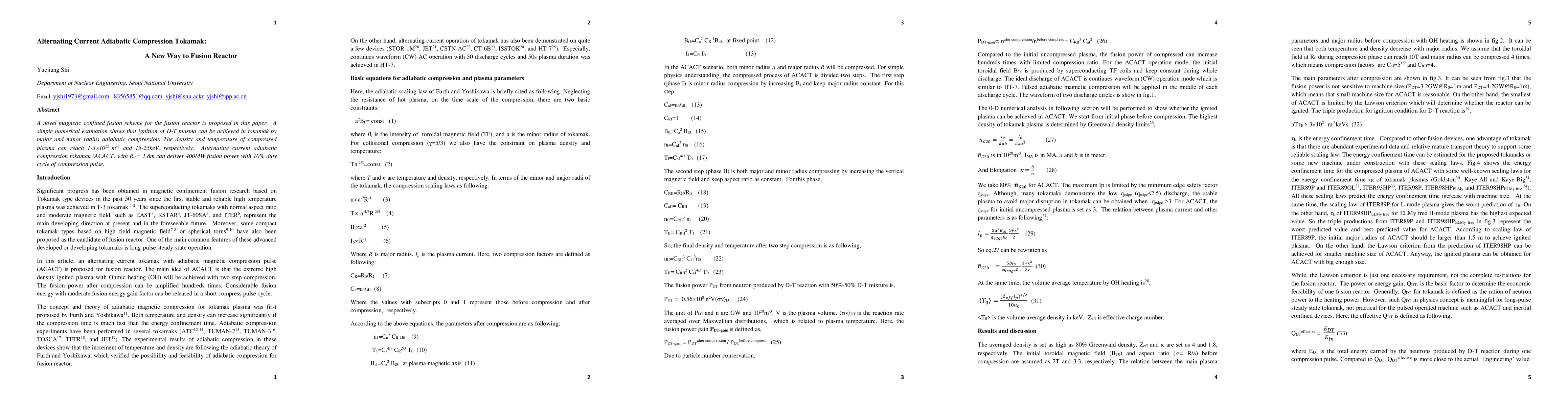 The paper proposes a new fusion reactor design, Alternating Current Adiabatic Compression Tokamak (ACACT), which can achieve D-T plasma ignition using only OH heating via major and minor radius adiabatic compression. This method could potentially yield plasma density and temperature of 1-3*10^22/m^3 and 15-25keV, respectively, and deliver 400MW fusion power with R0 = 1.8m.