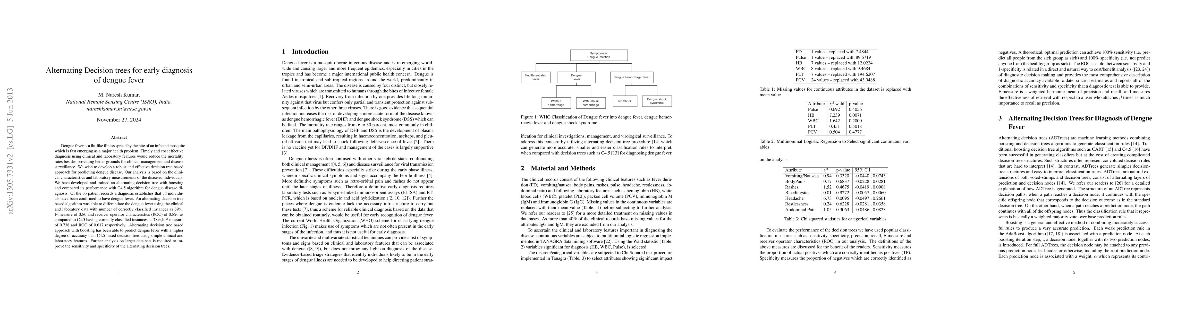 This research develops an alternating decision tree with boosting for diagnosing dengue fever using clinical and laboratory data, achieving higher accuracy (89% correctly classified) compared to the C4.5 algorithm (78% correctly classified). Further validation on larger datasets is recommended to enhance the model's sensitivity and specificity.