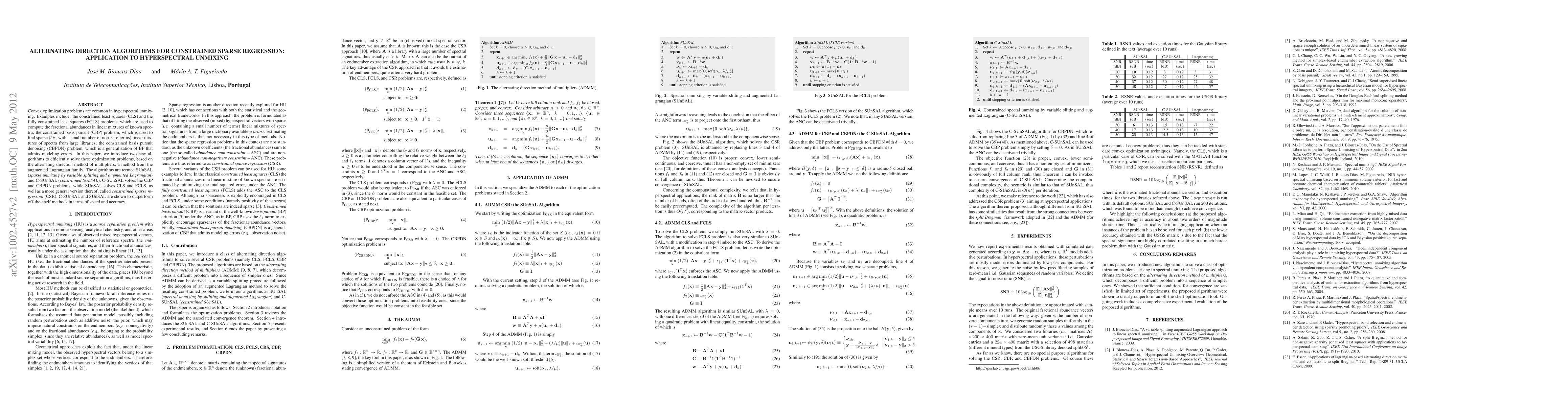 This paper introduces two new algorithms, SUnSAL and C-SUnSAL, based on the alternating direction method of multipliers to solve constrained sparse regression problems in hyperspectral unmixing. The algorithms outperform existing methods in both speed and accuracy.