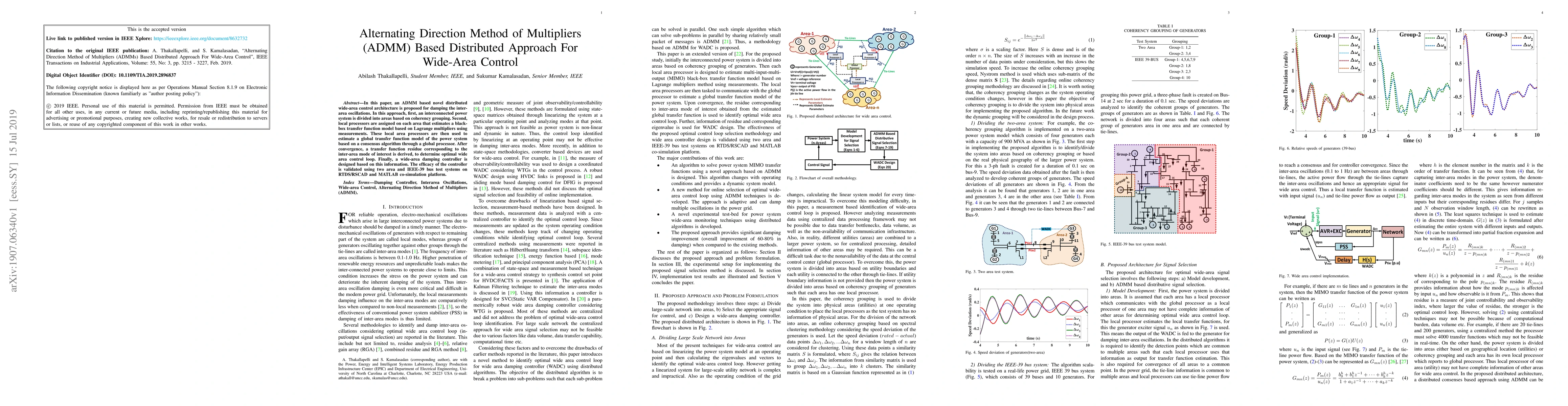 This paper proposes a novel distributed wide-area control architecture using the Alternating Direction Method of Multipliers (ADMM) to dampen interarea oscillations. It employs local processors to estimate global transfer function models and designs a wide-area damping controller validated on test systems.