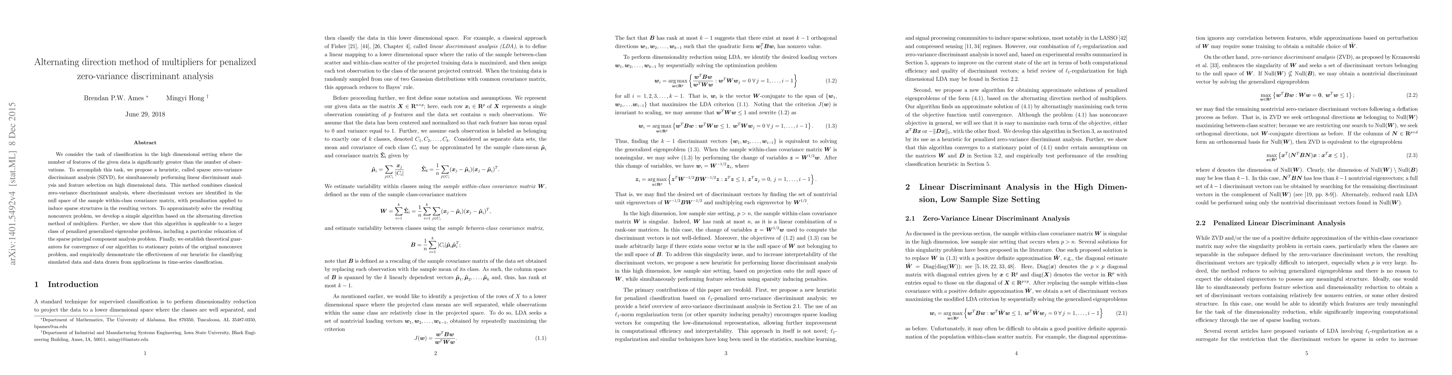 We consider the task of classification in the high dimensional setting where the number of features of the given data is significantly greater than the number of observations. To accomplish this task, we propose a heuristic, called sparse zero-variance discriminant analysis (SZVD), for simultaneously performing linear discriminant analysis and feature selection on high dimensional data. This method combines classical zero-variance discriminant analysis, where discriminant vectors are identified in the null space of the sample within-class covariance matrix, with penalization applied to induce sparse structures in the resulting vectors. To approximately solve the resulting nonconvex problem, we develop a simple algorithm based on the alternating direction method of multipliers. Further, we show that this algorithm is applicable to a larger class of penalized generalized eigenvalue problems, including a particular relaxation of the sparse principal component analysis problem. Finally, we establish theoretical guarantees for convergence of our algorithm to stationary points of the original nonconvex problem, and empirically demonstrate the effectiveness of our heuristic for classifying simulated data and data drawn from applications in time-series classification.