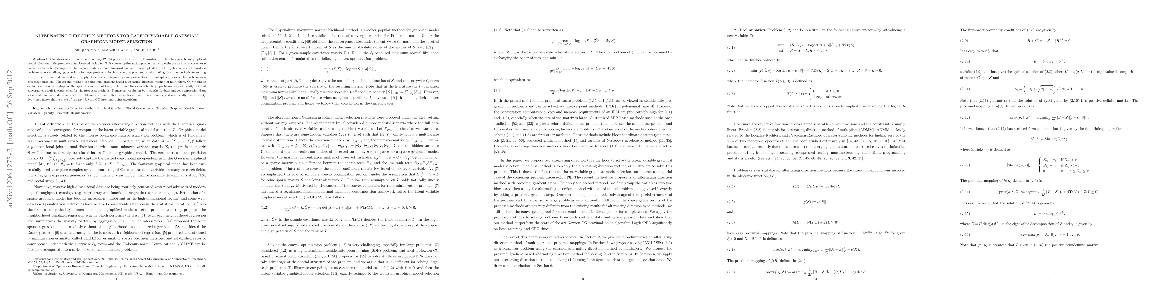 Chandrasekaran, Parrilo and Willsky (2010) proposed a convex optimization problem to characterize graphical model selection in the presence of unobserved variables. This convex optimization problem aims to estimate an inverse covariance matrix that can be decomposed into a sparse matrix minus a low-rank matrix from sample data. Solving this convex optimization problem is very challenging, especially for large problems. In this paper, we propose two alternating direction methods for solving this problem. The first method is to apply the classical alternating direction method of multipliers to solve the problem as a consensus problem. The second method is a proximal gradient based alternating direction method of multipliers. Our methods exploit and take advantage of the special structure of the problem and thus can solve large problems very efficiently. Global convergence result is established for the proposed methods. Numerical results on both synthetic data and gene expression data show that our methods usually solve problems with one million variables in one to two minutes, and are usually five to thirty five times faster than a state-of-the-art Newton-CG proximal point algorithm.