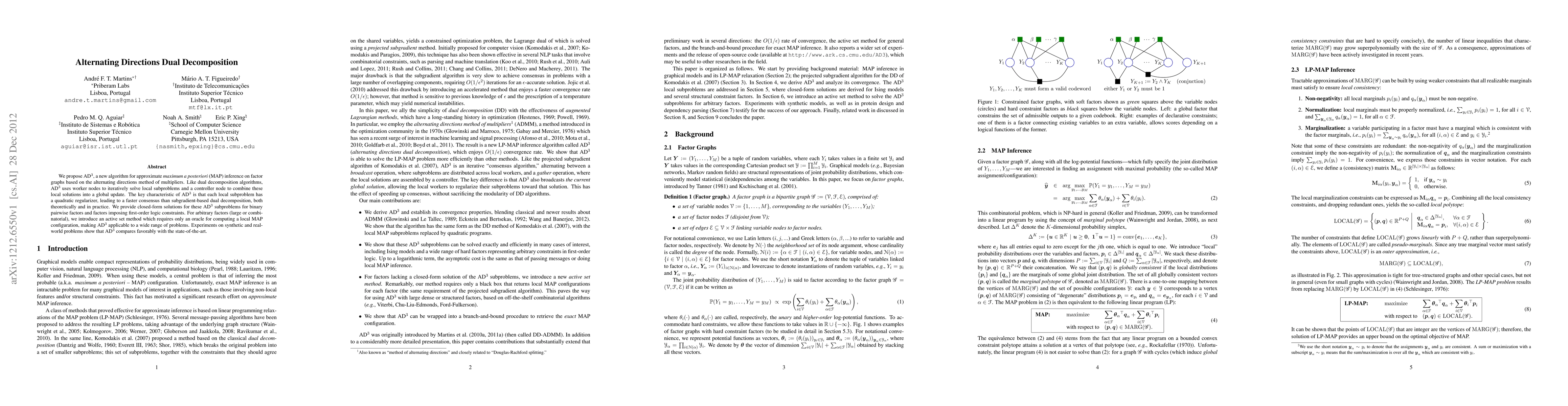 We propose AD3, a new algorithm for approximate maximum a posteriori (MAP) inference on factor graphs based on the alternating directions method of multipliers. Like dual decomposition algorithms, AD3 uses worker nodes to iteratively solve local subproblems and a controller node to combine these local solutions into a global update. The key characteristic of AD3 is that each local subproblem has a quadratic regularizer, leading to a faster consensus than subgradient-based dual decomposition, both theoretically and in practice. We provide closed-form solutions for these AD3 subproblems for binary pairwise factors and factors imposing first-order logic constraints. For arbitrary factors (large or combinatorial), we introduce an active set method which requires only an oracle for computing a local MAP configuration, making AD3 applicable to a wide range of problems. Experiments on synthetic and realworld problems show that AD3 compares favorably with the state-of-the-art.