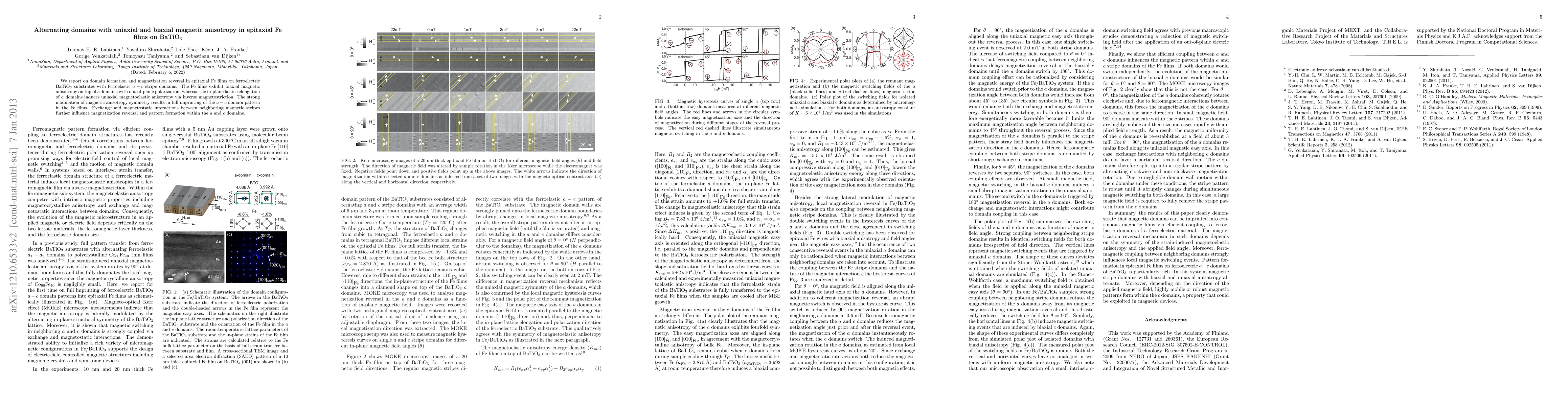 This paper investigates the interplay of magnetic anisotropy in epitaxial Fe films on BaTiO3 substrates, where alternating domains exhibit uniaxial and biaxial anisotropy due to substrate's ferroelastic domains, leading to imprinted domain patterns and complex magnetization reversal dynamics. Exchange and magnetostatic interactions further shape the magnetic behavior within these domains.