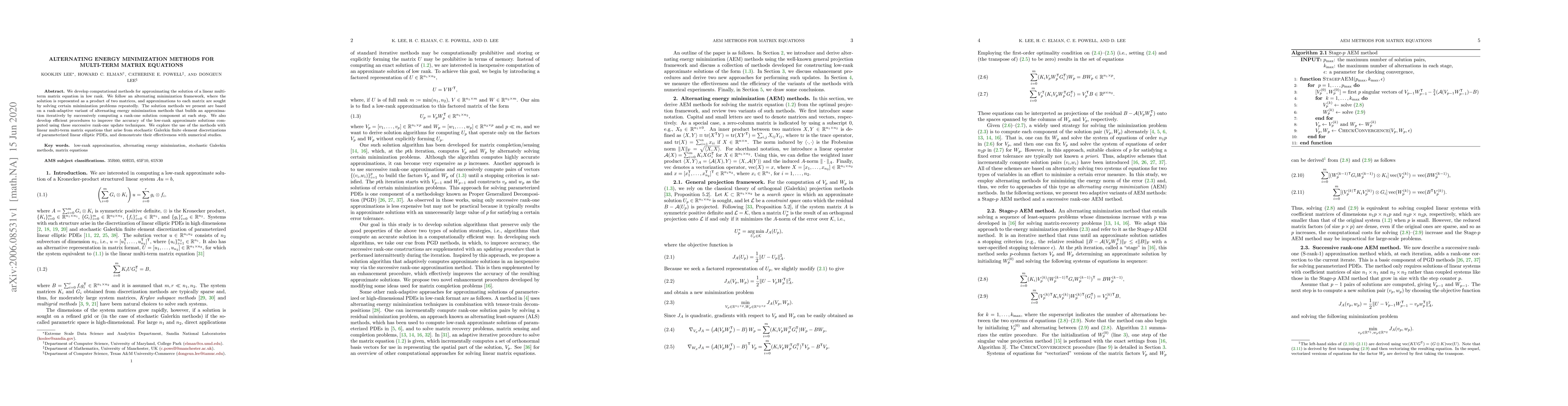 This paper introduces computational methods for approximating solutions to linear multi-term matrix equations using an alternating minimization framework. It employs iterative rank-adaptive techniques to build low-rank approximations and presents efficient procedures to enhance solution accuracy, demonstrating effectiveness through numerical studies on parameterized linear elliptic PDEs.