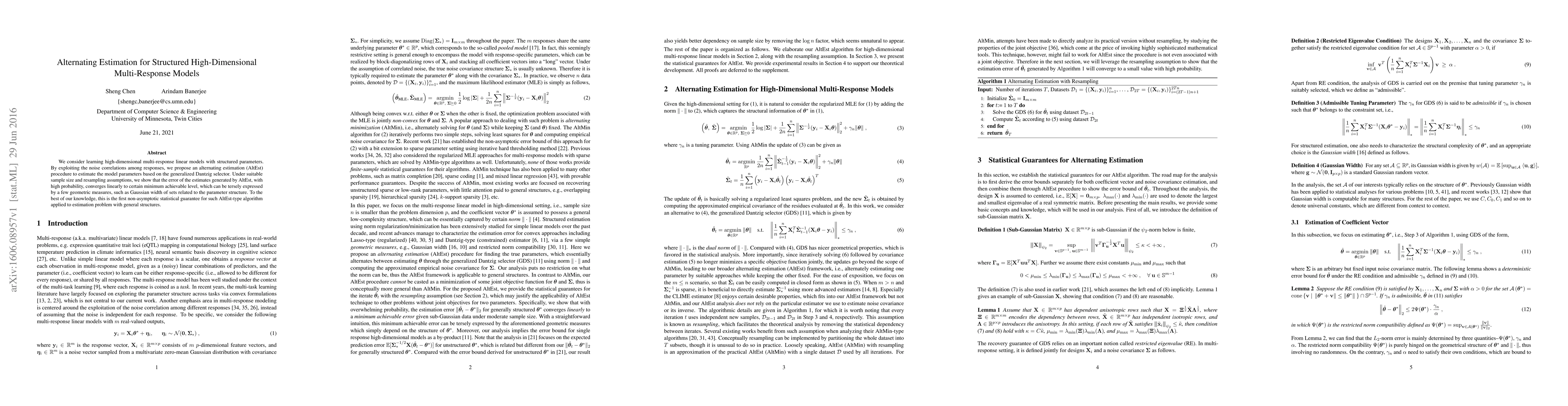 We consider learning high-dimensional multi-response linear models with structured parameters. By exploiting the noise correlations among responses, we propose an alternating estimation (AltEst) procedure to estimate the model parameters based on the generalized Dantzig selector. Under suitable sample size and resampling assumptions, we show that the error of the estimates generated by AltEst, with high probability, converges linearly to certain minimum achievable level, which can be tersely expressed by a few geometric measures, such as Gaussian width of sets related to the parameter structure. To the best of our knowledge, this is the first non-asymptotic statistical guarantee for such AltEst-type algorithm applied to estimation problem with general structures.