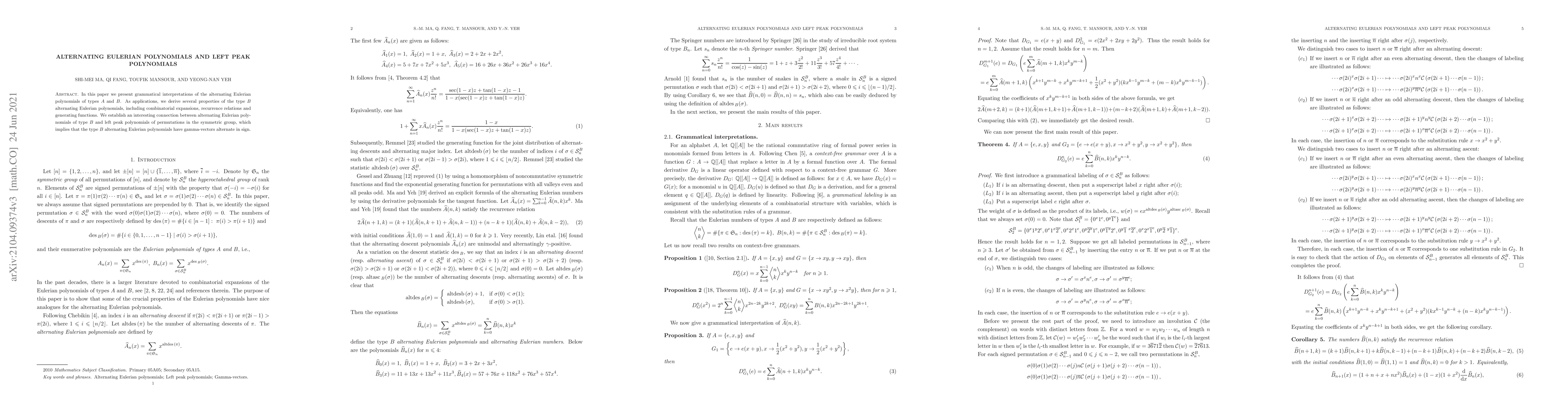 This paper explores grammatical interpretations of alternating Eulerian polynomials, deriving properties like expansions, recurrences, and generating functions. It establishes a connection between type B polynomials and left peak polynomials in symmetric groups, revealing that their gamma-vectors alternate in sign.