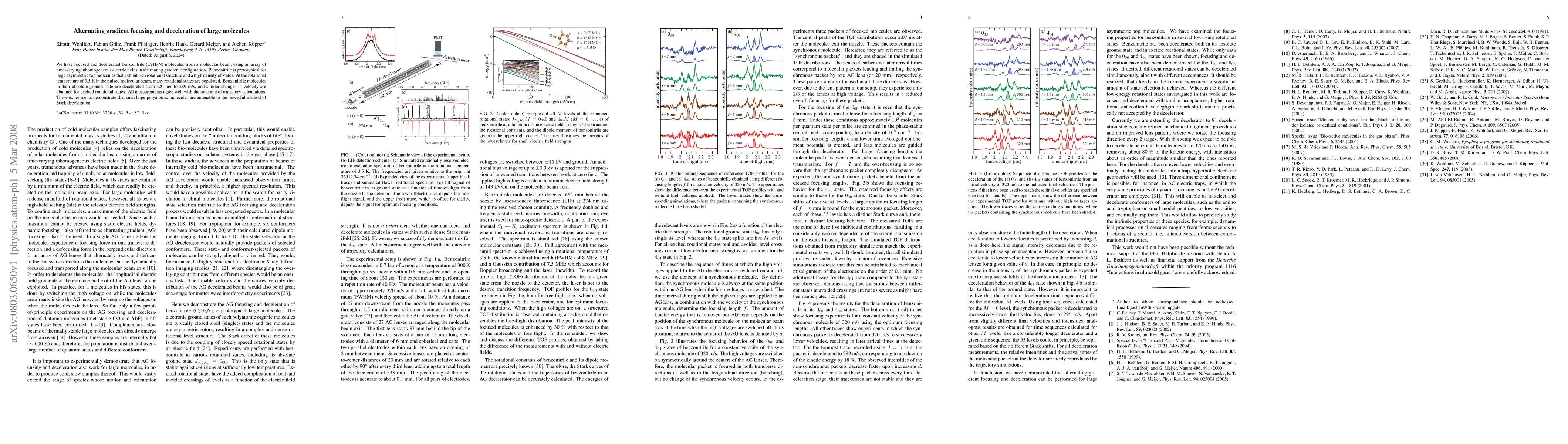 This research focuses on the deceleration of benzonitrile molecules using an alternating gradient configuration of time-varying electric fields. The study successfully reduces the velocity of both ground and excited rotational states of these large asymmetric molecules, demonstrating the effectiveness of Stark deceleration for complex polyatomic molecules.