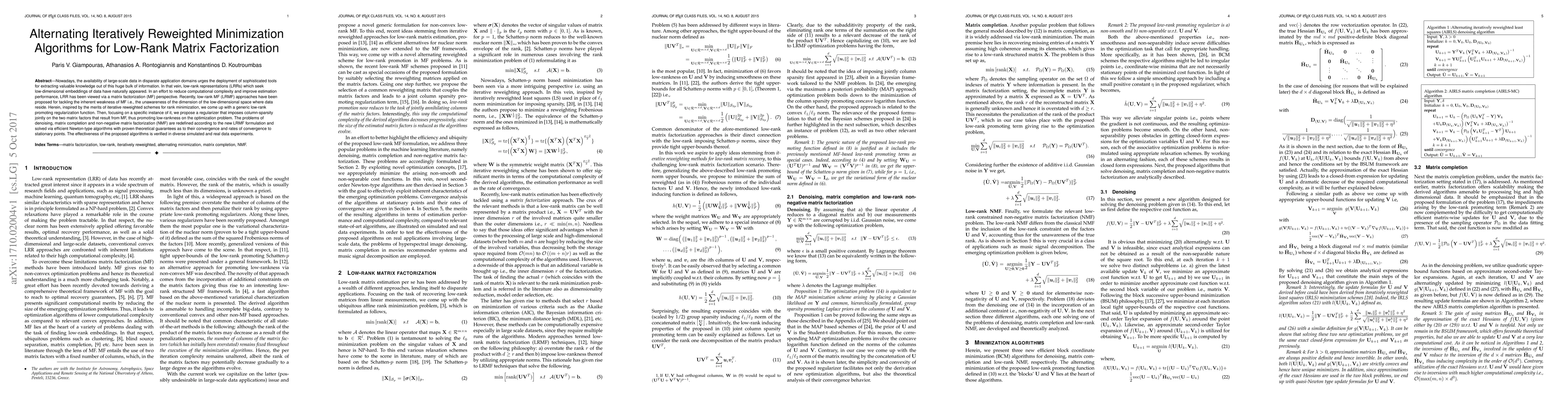 This paper proposes alternating iteratively reweighted minimization algorithms for low-rank matrix factorization (LRMF) to enhance the estimation performance and reduce computational complexity. The approach introduces a new low-rank promoting regularization function and solves problems like denoising, matrix completion, and non-negative matrix factorization using efficient Newton-type algorithms, with theoretical guarantees for convergence.