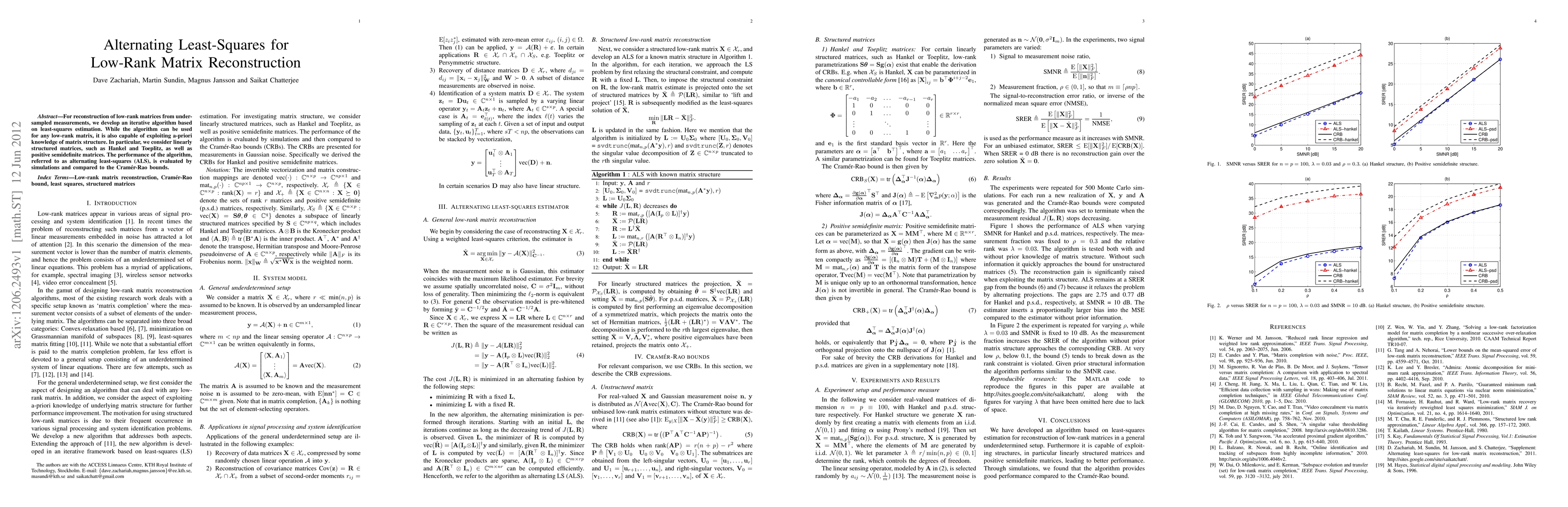 For reconstruction of low-rank matrices from undersampled measurements, we develop an iterative algorithm based on least-squares estimation. While the algorithm can be used for any low-rank matrix, it is also capable of exploiting a-priori knowledge of matrix structure. In particular, we consider linearly structured matrices, such as Hankel and Toeplitz, as well as positive semidefinite matrices. The performance of the algorithm, referred to as alternating least-squares (ALS), is evaluated by simulations and compared to the Cram\'er-Rao bounds.
