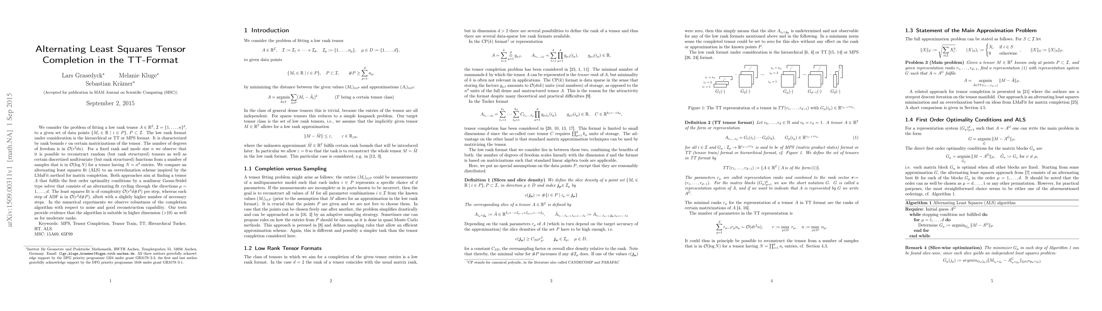 This paper proposes an alternating least squares (ALS) method for tensor completion in the TT-format, comparing it to an overrelaxation scheme. The ALS method is shown to be robust and effective for reconstructing low-rank tensors from a minimal number of data points, with good performance in higher dimensions and moderate ranks.