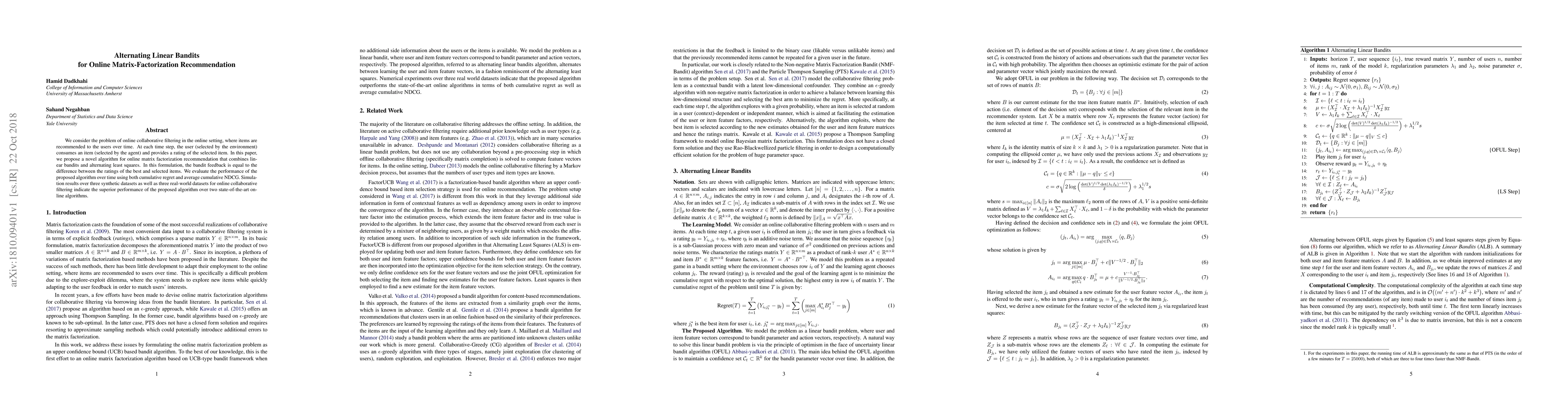 This paper proposes a novel algorithm for online matrix factorization recommendation that combines linear bandits and alternating least squares, outperforming two state-of-the-art algorithms in simulations over synthetic and real-world datasets.
