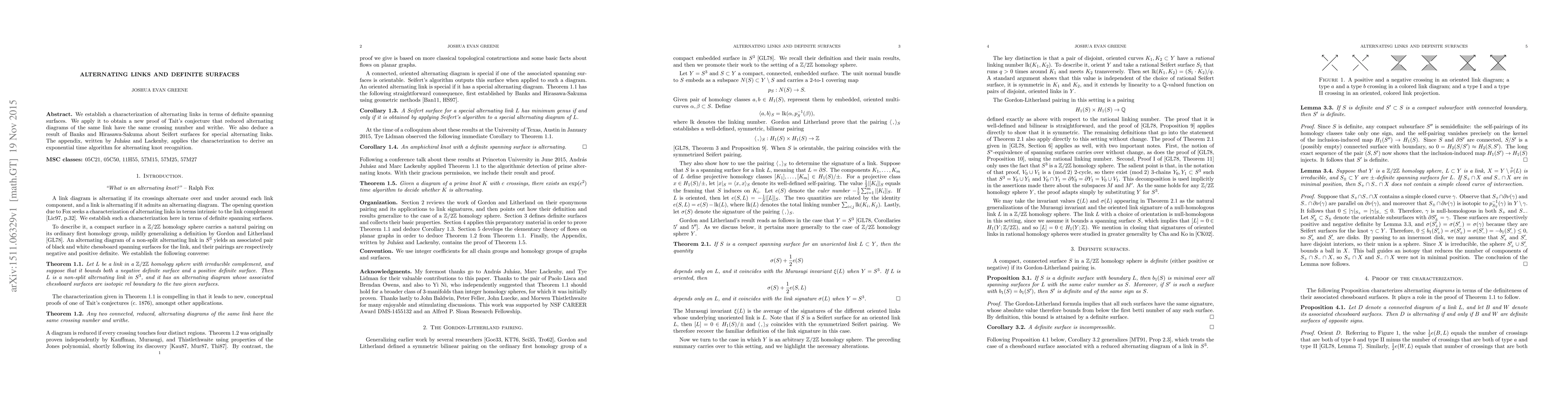 This paper characterizes alternating links via definite spanning surfaces, providing a new proof for Tait's conjecture on the crossing number and writhe of reduced alternating diagrams. It also extends results on Seifert surfaces for specific alternating links and includes an appendix detailing an exponential time algorithm for alternating knot recognition.