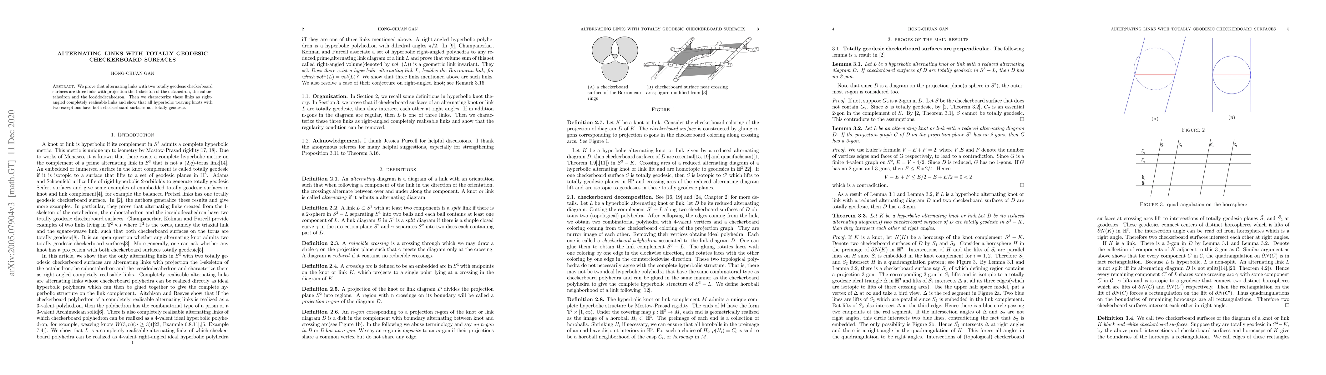 Summary: This paper proves that alternating links with two totally geodesic checkerboard surfaces correspond to the 1-skeletons of the octahedron, cuboctahedron, and icosidodecahedron. It also characterizes these links as right-angled realisable and notes that most hyperbolic weaving knots lack totally geodesic checkerboard surfaces.