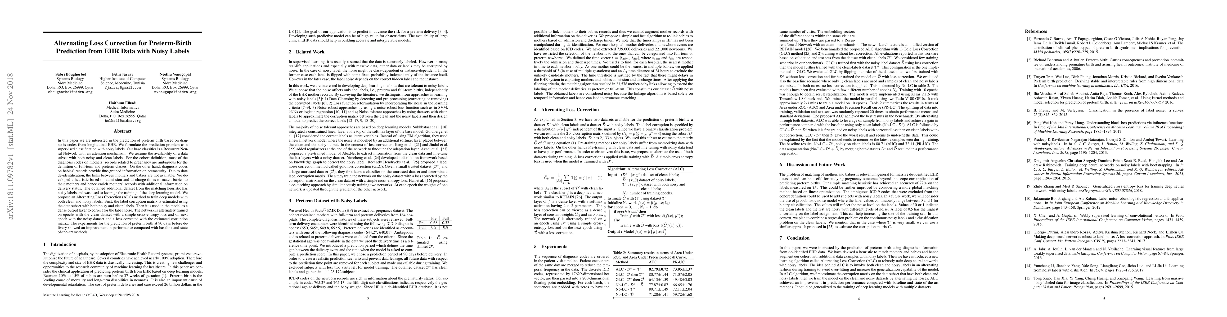 This paper proposes an Alternating Loss Correction (ALC) method to predict preterm birth from EHR data, using a Recurrent Neural Network with an attention mechanism. The ALC method corrects for noisy labels by estimating a label corruption matrix and alternately training the model on clean and noisy datasets, leading to improved performance compared to baseline methods.