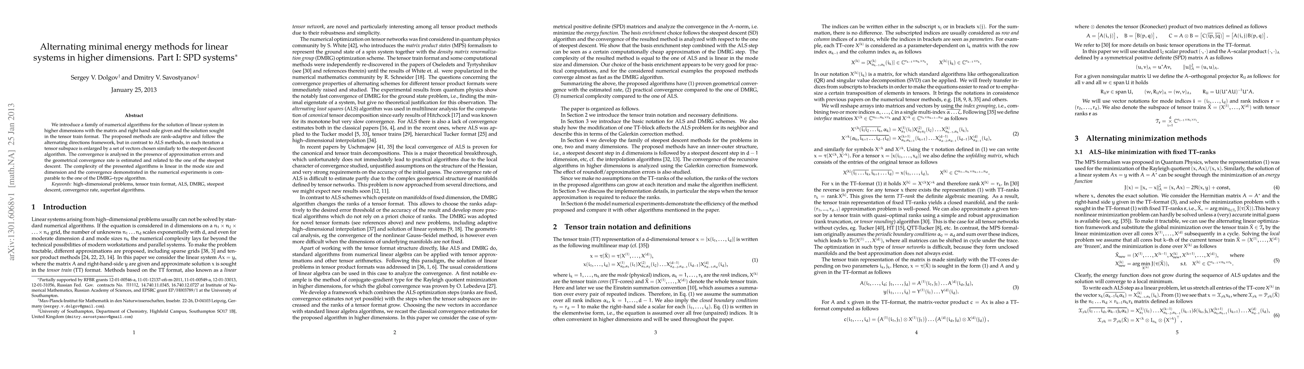 We introduce a family of numerical algorithms for the solution of linear system in higher dimensions with the matrix and right hand side given and the solution sought in the tensor train format. The proposed methods are rank--adaptive and follow the alternating directions framework, but in contrast to ALS methods, in each iteration a tensor subspace is enlarged by a set of vectors chosen similarly to the steepest descent algorithm. The convergence is analyzed in the presence of approximation errors and the geometrical convergence rate is estimated and related to the one of the steepest descent. The complexity of the presented algorithms is linear in the mode size and dimension and the convergence demonstrated in the numerical experiments is comparable to the one of the DMRG--type algorithm.