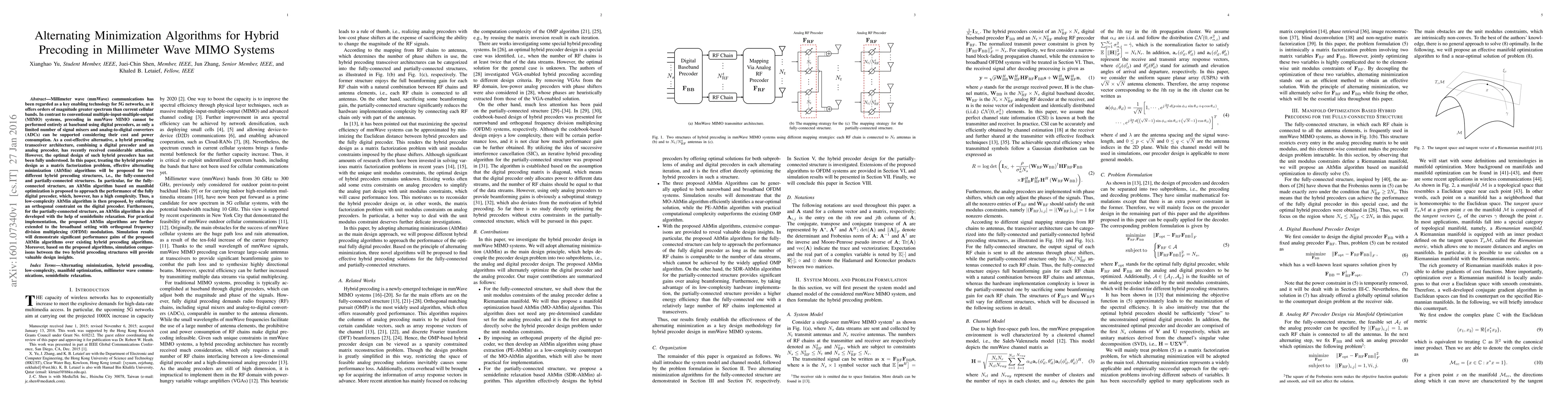 This paper proposes alternating minimization (AltMin) algorithms for hybrid precoding in millimeter wave MIMO systems, addressing the challenge of combining digital and analog precoders. The authors develop AltMin algorithms for both fully-connected and partially-connected hybrid precoding structures, demonstrating significant performance gains over existing methods through simulations.