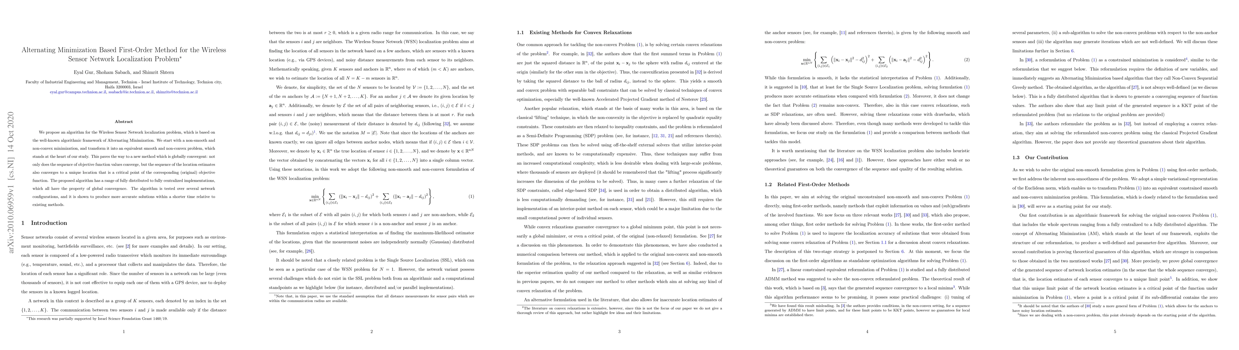 This paper introduces an alternating minimization-based first-order method for wireless sensor network localization, transforming a non-smooth, non-convex problem into a smooth equivalent, ensuring global convergence. The proposed algorithm offers both distributed and centralized implementations, demonstrating improved accuracy and faster convergence compared to existing methods.