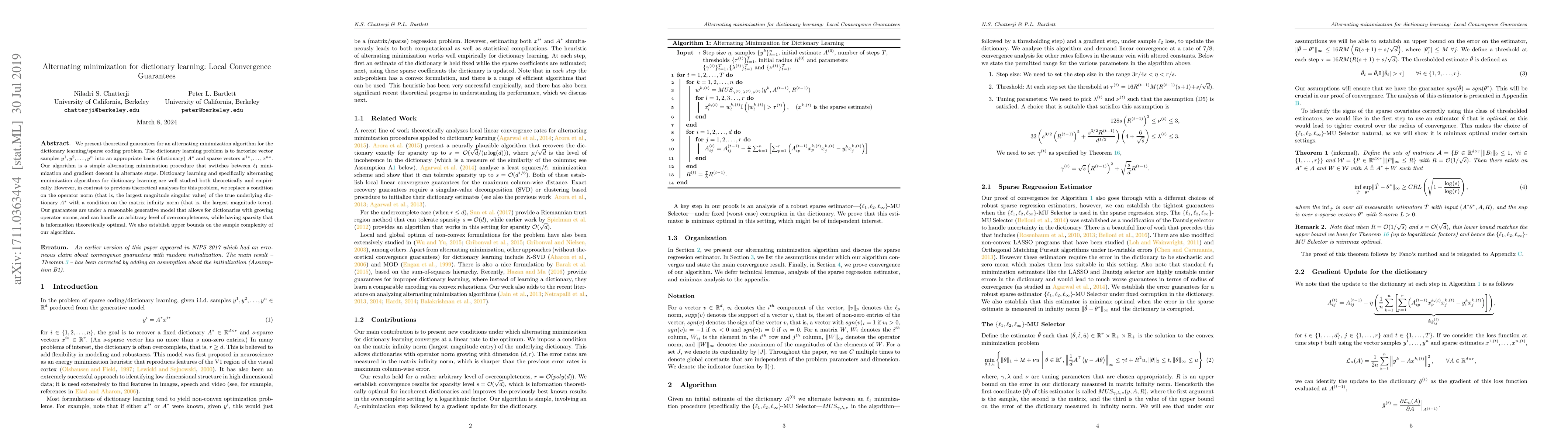 This paper provides theoretical convergence guarantees for an alternating minimization algorithm used in dictionary learning, focusing on replacing a condition on the operator norm with a condition on the matrix infinity norm. The analysis allows for dictionaries with growing norms and handles overcompleteness while maintaining optimal sparsity.