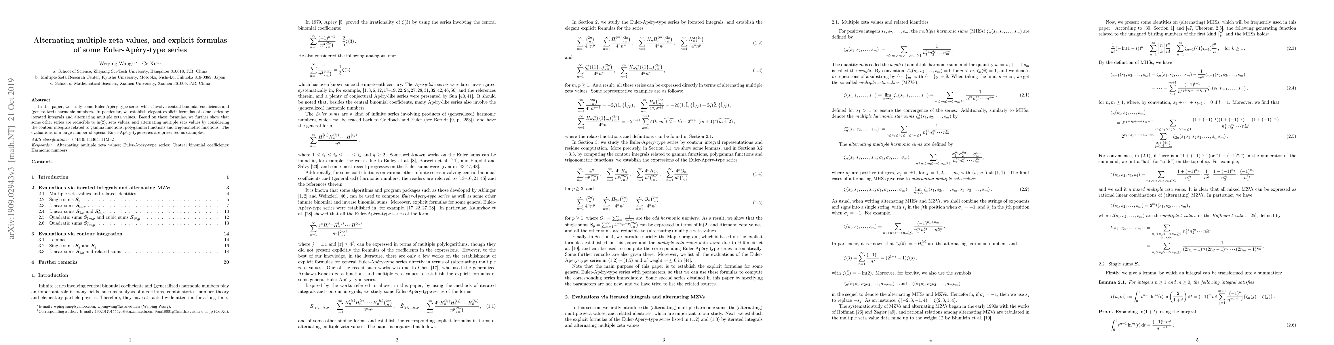 This paper investigates Euler-Apéry-type series involving binomial coefficients and harmonic numbers, deriving explicit formulas using iterated integrals and alternating multiple zeta values. It demonstrates that these series can be reduced to simpler forms involving ln(2), zeta values, and alternating multiple zeta values through contour integrals involving gamma, polygamma, and trigonometric functions.