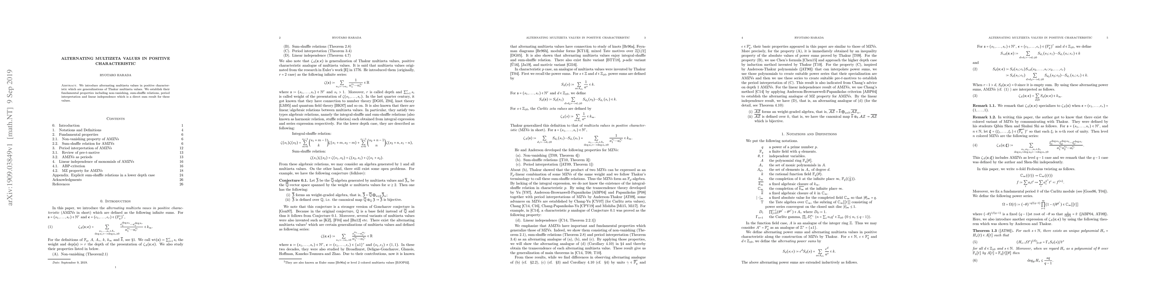 Summary: This paper introduces alternating multizeta values in positive characteristic, generalizing Thakur multizeta values, and establishes their fundamental properties such as non-vanishing, sum-shuffle relations, period interpretation, and linear independence.