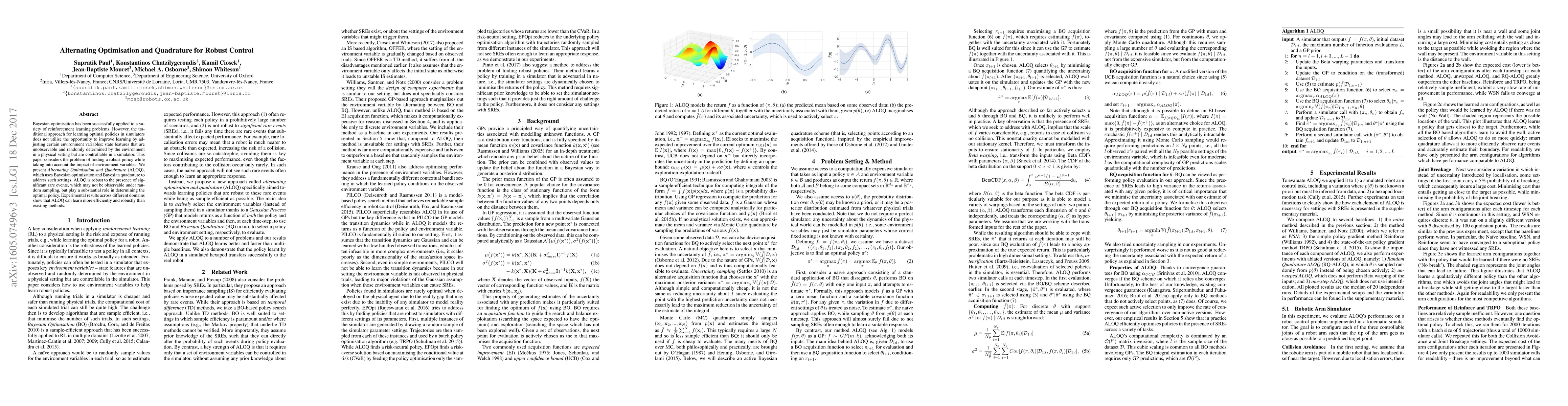 Bayesian optimisation has been successfully applied to a variety of reinforcement learning problems. However, the traditional approach for learning optimal policies in simulators does not utilise the opportunity to improve learning by adjusting certain environment variables: state features that are unobservable and randomly determined by the environment in a physical setting but are controllable in a simulator. This paper considers the problem of finding a robust policy while taking into account the impact of environment variables. We present Alternating Optimisation and Quadrature (ALOQ), which uses Bayesian optimisation and Bayesian quadrature to address such settings. ALOQ is robust to the presence of significant rare events, which may not be observable under random sampling, but play a substantial role in determining the optimal policy. Experimental results across different domains show that ALOQ can learn more efficiently and robustly than existing methods.