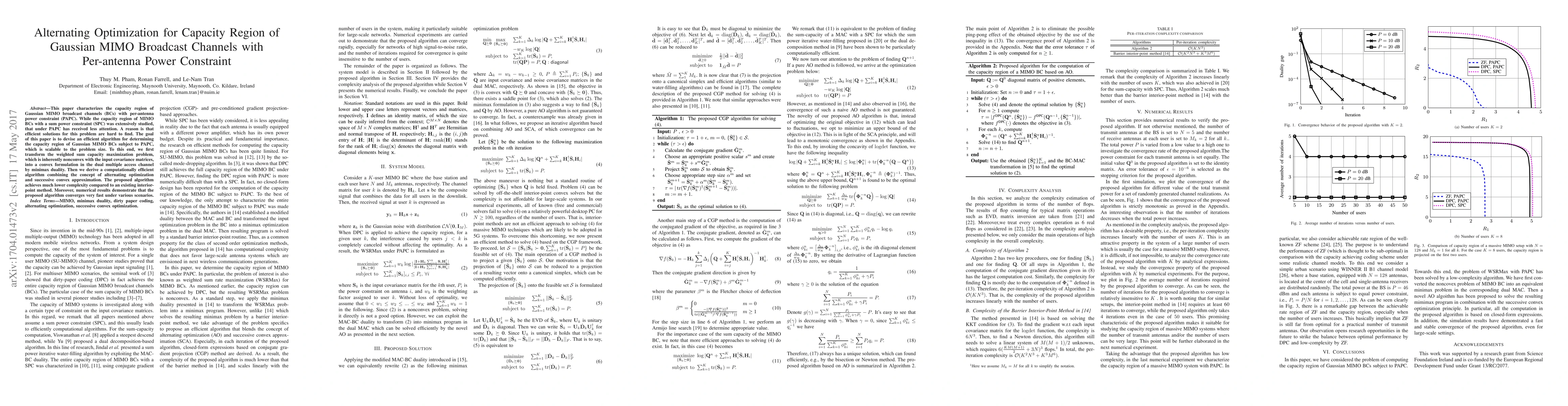 This paper proposes an efficient alternating optimization algorithm for determining the capacity region of Gaussian MIMO broadcast channels under per-antenna power constraints, transforming the nonconvex problem into a convex form via dual multiple access channel and achieving lower complexity compared to existing methods. Numerical results show rapid convergence.
