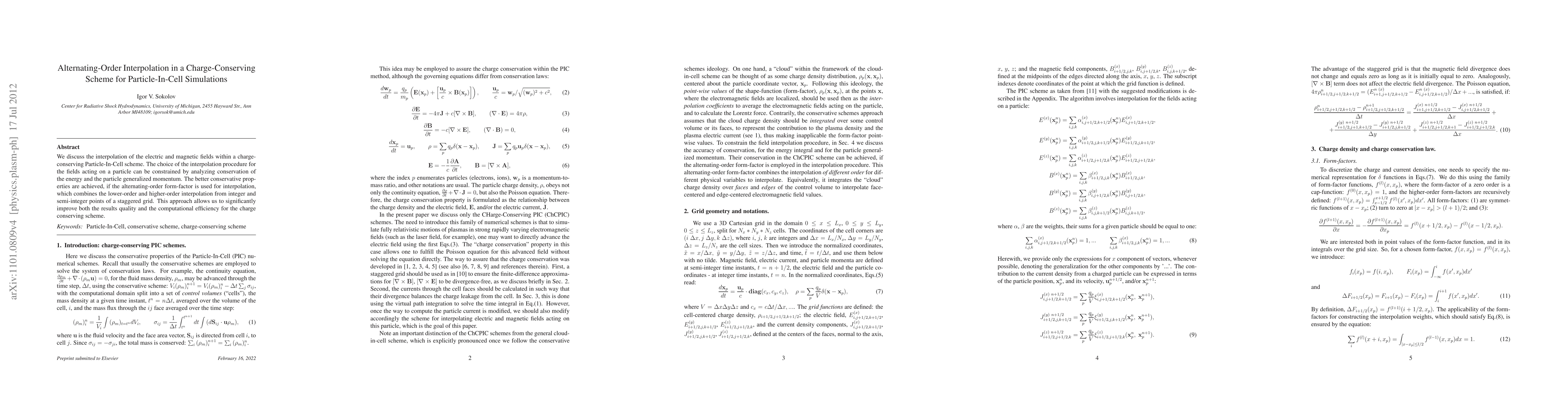 We discuss the interpolation of the electric and magnetic fields within a charge-conserving Particle-In-Cell scheme. The choice of the interpolation procedure for the fields acting on a particle can be constrained by analyzing conservation of the energy and the particle generalized momentum. The better conservative properties are achieved, if the alternating-order form-factor is used for interpolation, which combines the lower-order and higher-order interpolation from integer and semi-integer points of a staggered grid. This approach allows us to significantly reduce noise in the charge conserving scheme and improves both the results quality and the computational efficiency.