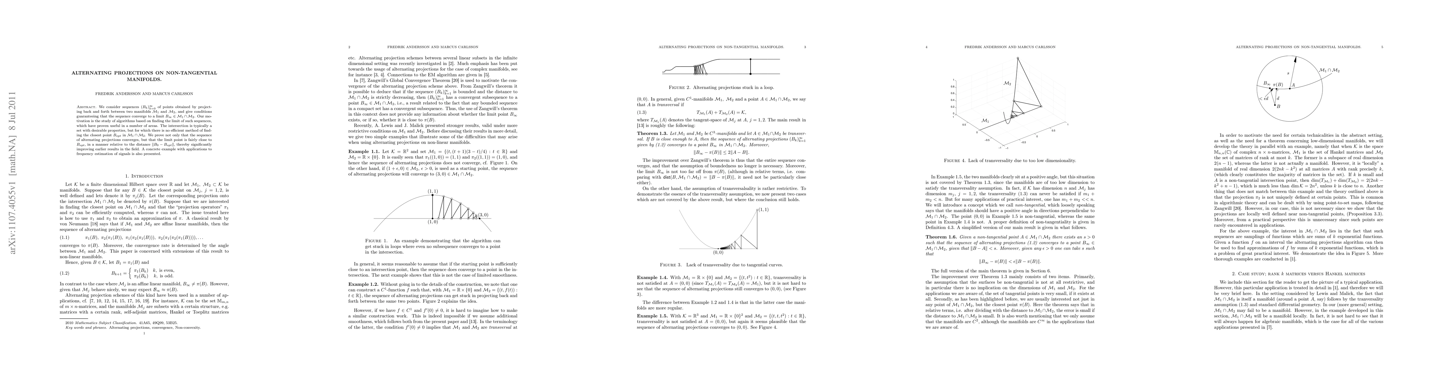 This paper studies sequences of alternating projections between two non-tangential manifolds, proving convergence to a limit point within the intersection of the manifolds. It demonstrates that the limit is close to the optimal point, improving upon previous results and providing a useful algorithm for applications like signal frequency estimation.