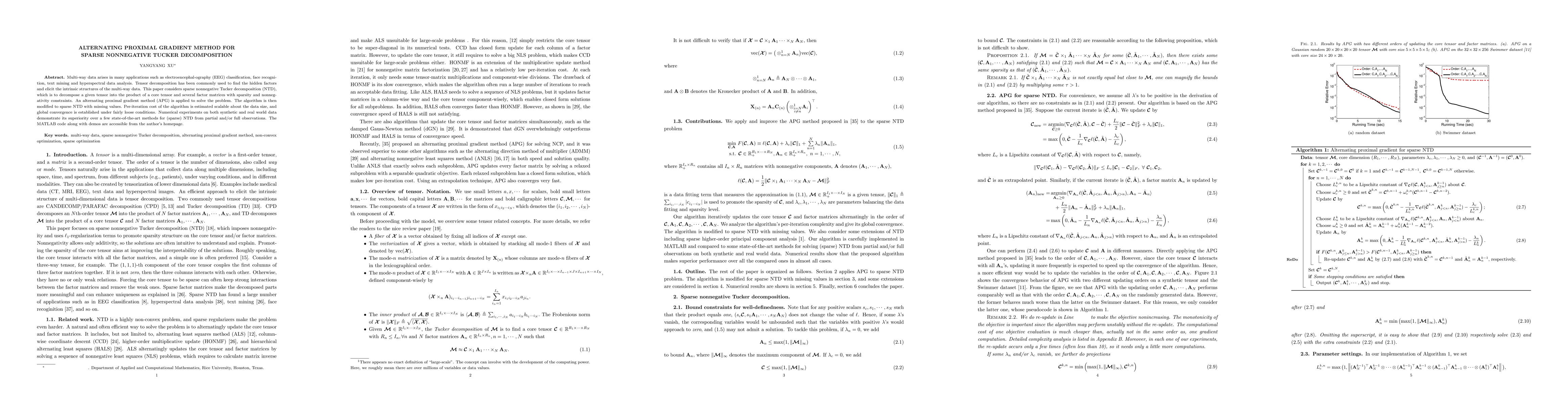 This paper proposes an alternating proximal gradient method to solve sparse nonnegative Tucker decomposition for multi-way data analysis, demonstrating its effectiveness through numerical experiments on synthetic and real datasets. The algorithm is scalable and shows superior performance compared to existing methods.