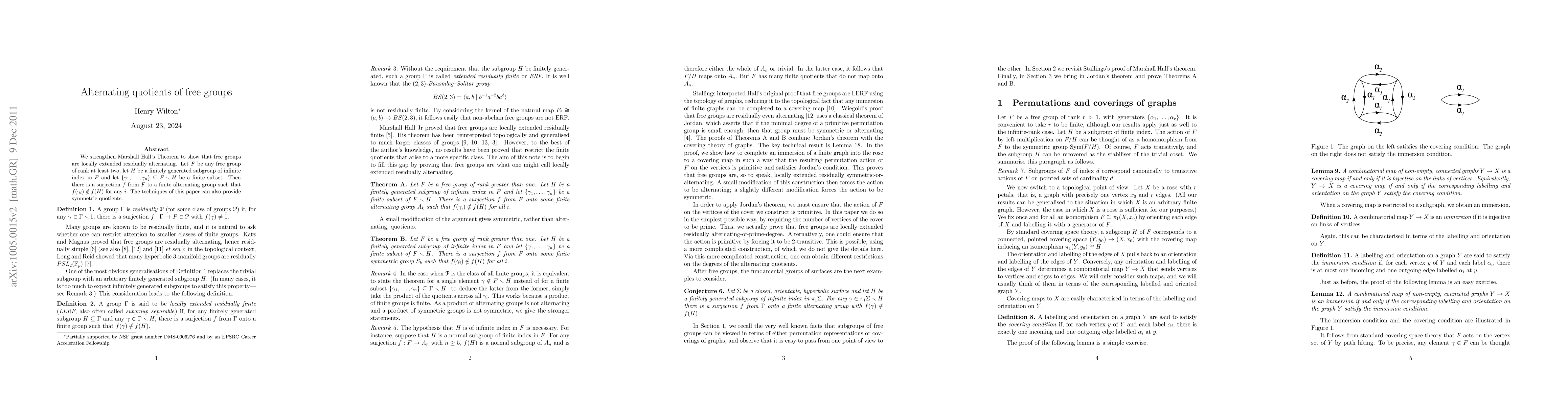 This paper strengthens Marshall Hall's Theorem by proving that free groups are locally extended residually alternating, showing that any finitely generated subgroup of infinite index in a free group can be mapped to a finite alternating group in a way that excludes certain elements. The techniques also extend to provide symmetric quotients.