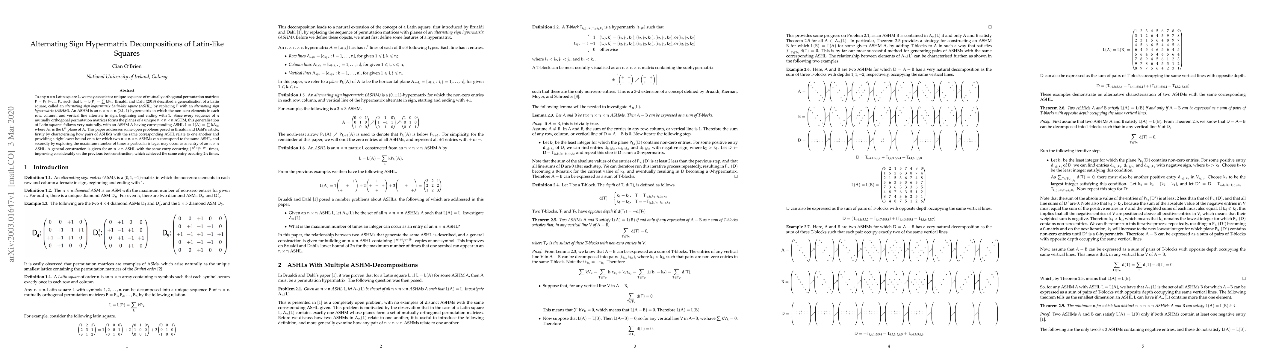This paper explores the decomposition of alternating sign hypermatrix Latin-like squares (ASHL) into alternating sign hypermatrices (ASHM), addressing open problems regarding the relationship between pairs of ASHMs and the maximum frequency of an entry in an ASHL. It provides a tighter lower bound for ASHMs corresponding to the same ASHL and a new construction for ASHLs with improved maximum entry frequency.