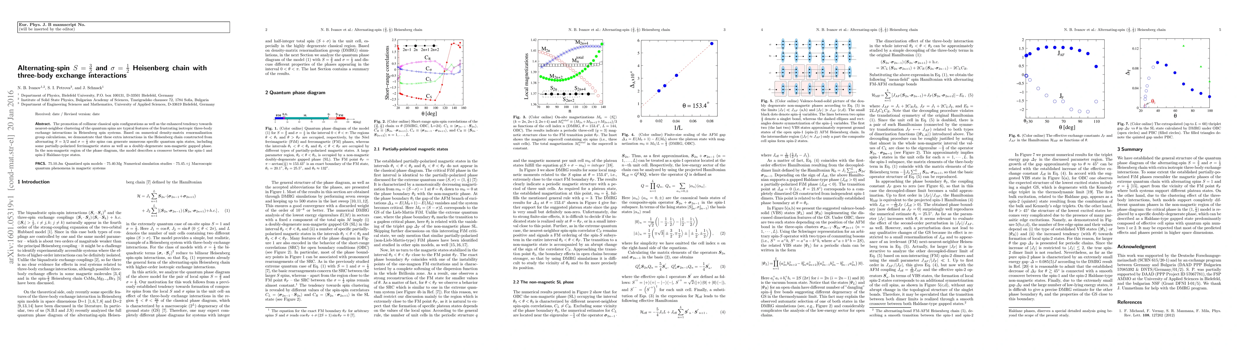 The study reveals that a Heisenberg chain with alternating S=3/2 and sigma=1/2 spins and three-body exchange interactions leads to diverse quantum spin states, including partially-polarized ferrimagnetic states and a gapped non-magnetic phase, exhibiting a crossover to Haldane-type states. Numerical density-matrix renormalization group calculations highlight these unique spin configurations and behaviors.