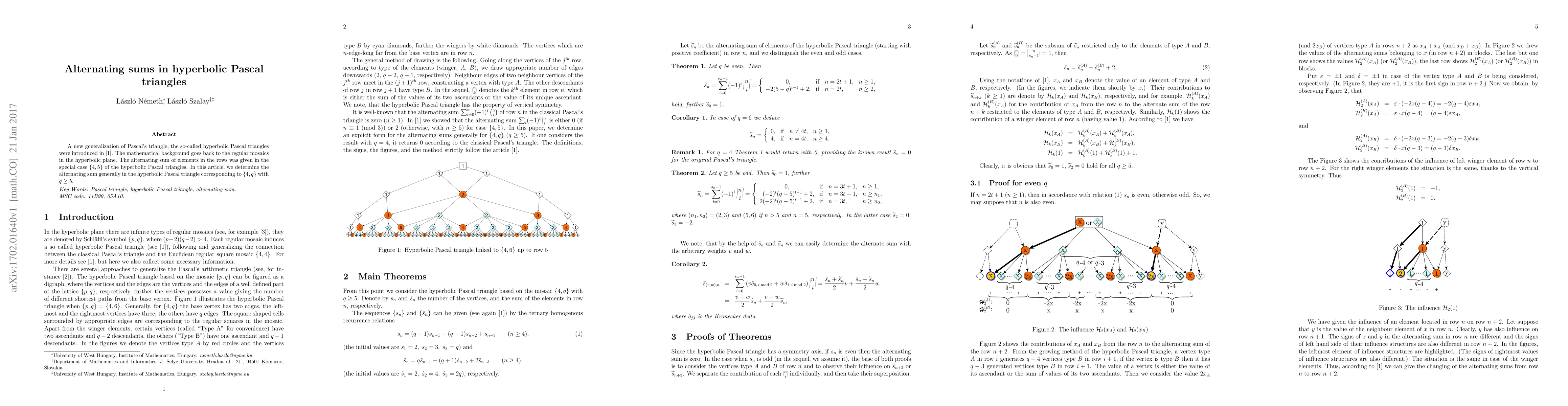 This paper generalizes Pascal's triangle to hyperbolic Pascal triangles, exploring their mathematical foundation linked to hyperbolic plane mosaics. The authors determine the general formula for the alternating sum of elements in the rows of hyperbolic Pascal triangles corresponding to the $\{4,q\}$ case, where $q$ is greater than or equal to 5.