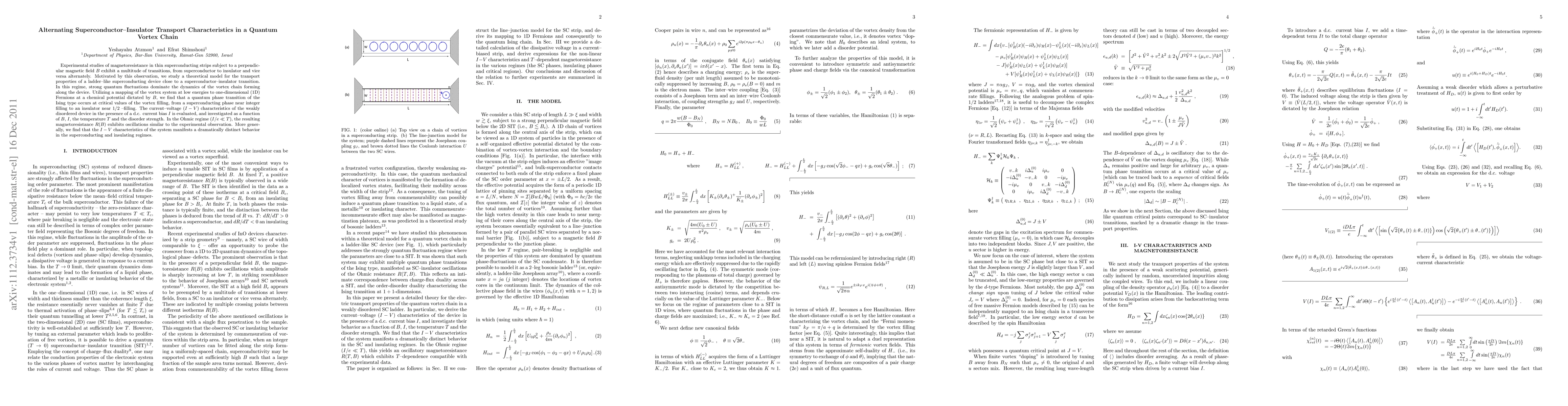 Experimental studies of magnetoresistance in thin superconducting strips subject to a perpendicular magnetic field B exhibit a multitude of transitions, from superconductor to insulator and vice versa alternately. Motivated by this observation, we study a theoretical model for the transport properties of a ladder--like superconducting device close to a superconductor--insulator transition. In this regime, strong quantum fluctuations dominate the dynamics of the vortex chain forming along the device. Utilizing a mapping of the vortex system at low energies to one-dimensional (1D) Fermions at a chemical potential dictated by B, we find that a quantum phase transition of the Ising type occurs at critical values of the vortex filling, from a superconducting phase near integer filling to an insulator near 1/2-filling. The current--voltage (I-V) characteristics of the weakly disordered device in the presence of a d.c. current bias I is evaluated, and investigated as a function of B, I, the temperature T and the disorder strength. In the Ohmic regime (I/e << T), the resulting magnetoresistance R(B) exhibits oscillations similar to the experimental observation. More generally, we find that the I-V characteristics of the system manifests a dramatically distinct behavior in the superconducting and insulating regimes.