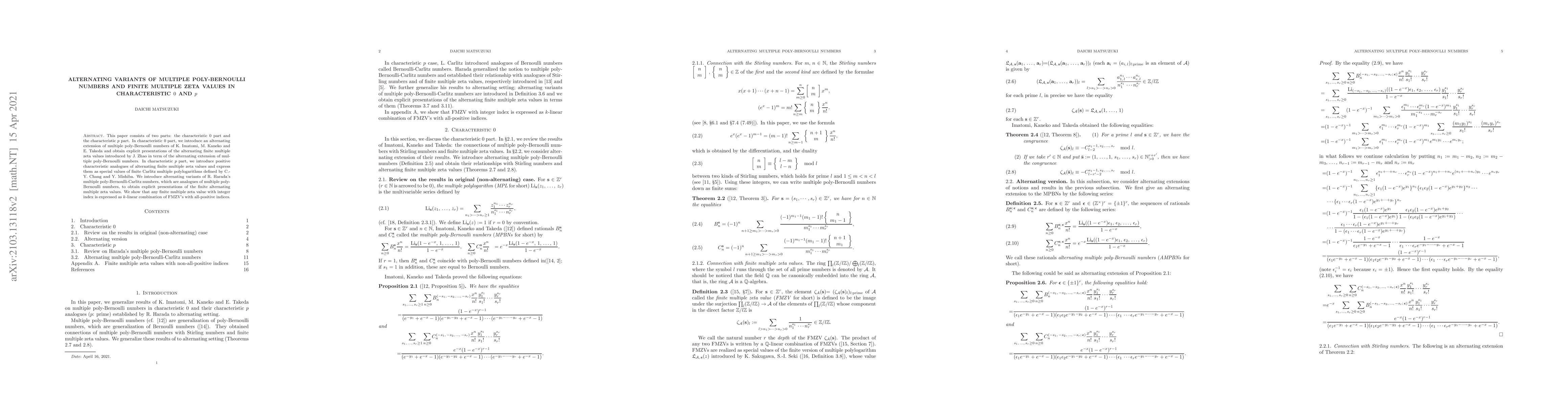 Alternating variants of multiple poly-Bernoulli numbers and finite multiple zeta values in characteristic 0 and p This paper consists of two parts: the characteristic 0 part and the characteristic p part. In characteristic 0 part, we introduce an alternating extension of multiple poly-Bernoulli numbers of K. Imatomi, M. Kaneko and E. Takeda and obtain explicit presentations of the alternating finite multiple zeta values introduced by J. Zhao in term of the alternating extension of multiple poly-Bernoulli numbers. In characteristic p part, we introduce positive characteristic analogues of alternating finite multiple zeta values and express them as special values of finite Carlitz multiple polylogarithms defined by C.-Y. Chang and Y. Mishiba. We introduce alternating variants of R. Harada's multiple poly-Bernoulli-Carlitz numbers, which are analogues of multiple poly-Bernoulli numbers, to obtain explicit presentations of the finite alternating multiple zeta values. We show that any finite multiple zeta value with integer index is expressed as k-linear combination of FMZV's with all-positive indices.