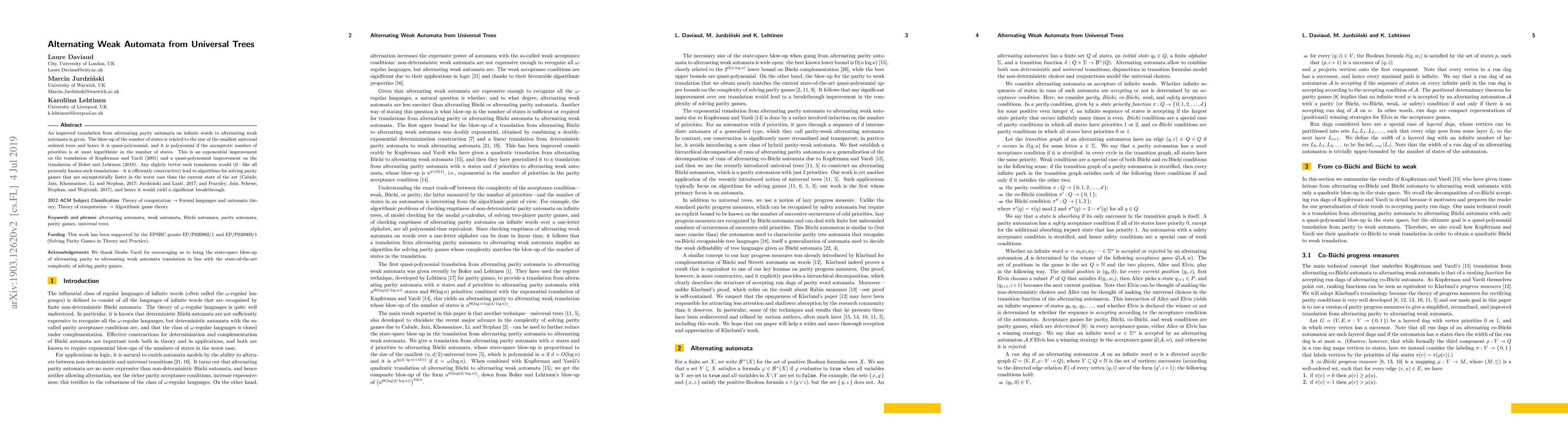 An improved translation from alternating parity automata on infinite words to alternating weak automata is given. The blow-up of the number of states is related to the size of the smallest universal ordered trees and hence it is quasi-polynomial, and only polynomial if the asymptotic number of priorities is logarithmic in the number of states. This is an exponential improvement on the translation of Kupferman and Vardi (2001) and a quasi-polynomial improvement on the translation of Boker and Lehtinen (2018). Any slightly better such translation would (if---like all presently known such translations---it is efficiently constructive) lead to algorithms for solving parity games that are asymptotically faster in the worst case than the current state of the art (Calude, Jain, Khoussainov, Li, and Stephan, 2017; Jurdzi\'nski and Lazi\'c, 2017; and Fearnley, Jain, Schewe, Stephan, and Wojtczak, 2017), and hence it would yield a significant breakthrough.
