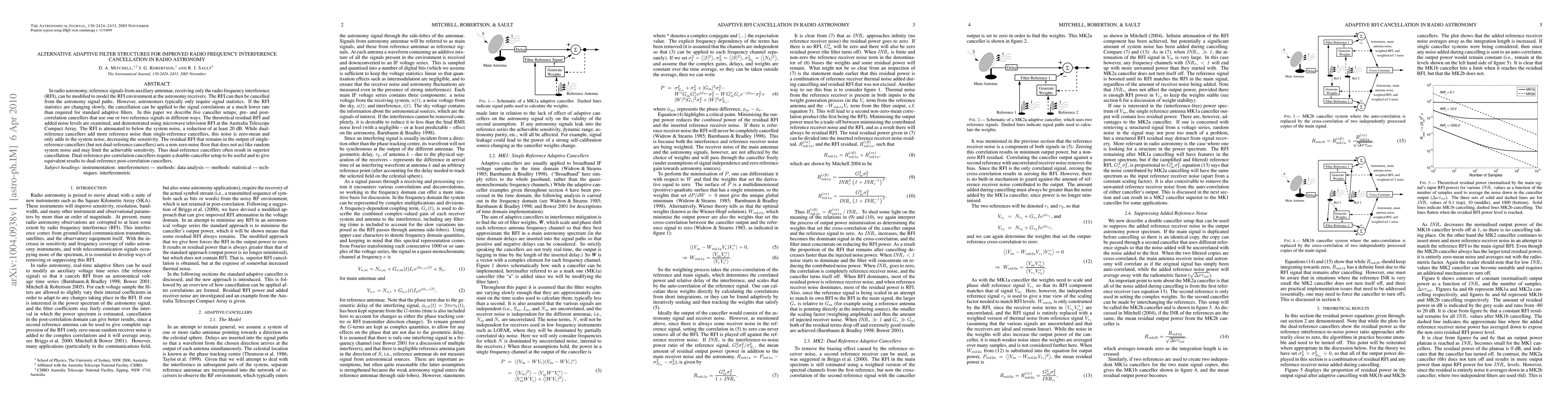 This paper explores five alternative adaptive filter structures for canceling radio frequency interference (RFI) in radio astronomy, using reference signals from auxiliary antennas. The methodology includes precorrelation and postcorrelation cancelers with one or two references. The research demonstrates that dual-reference cancelers often outperform single-reference ones, attenuating RFI below system noise by at least 20 dB. Despite adding reference noise, dual-reference cancelers improve cancellation, while dual-reference precorrelation cancelers need a double-canceler setup for equivalent results.